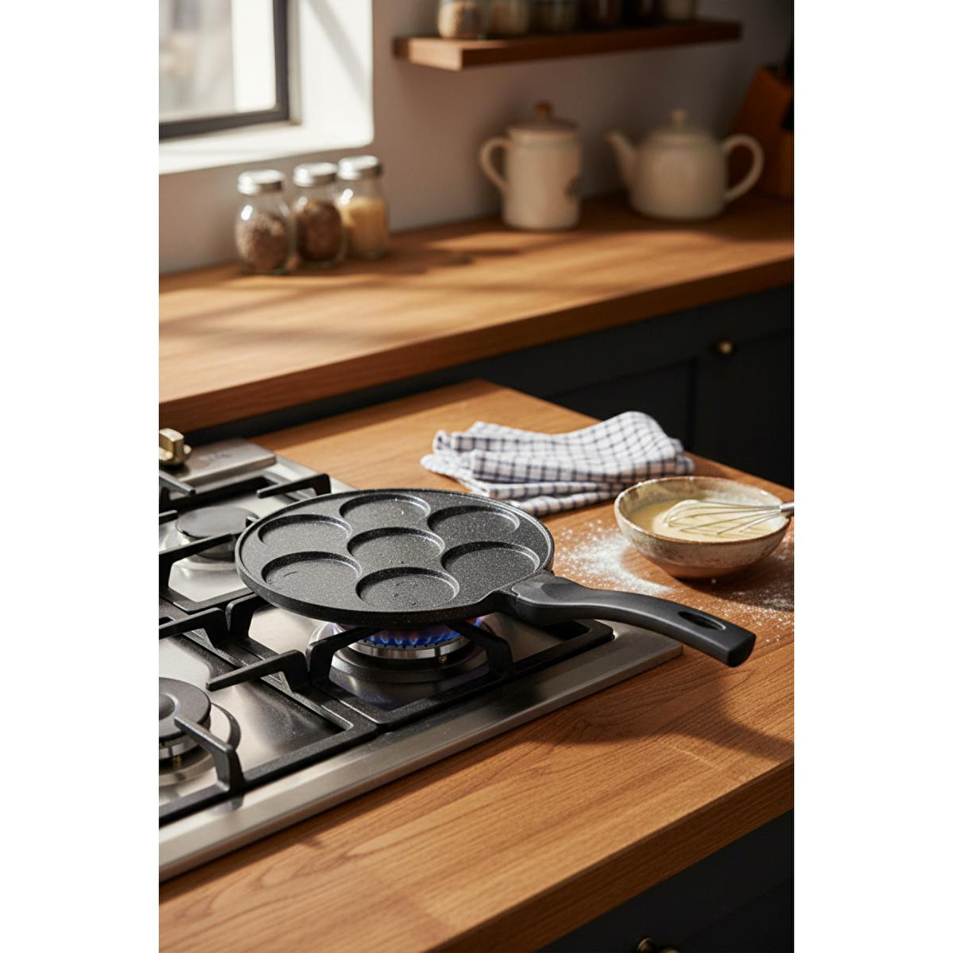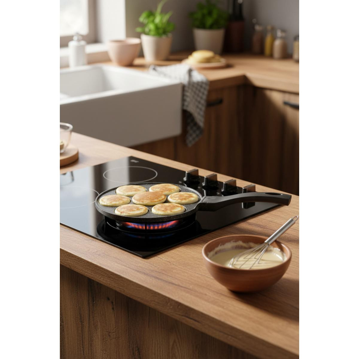 Ürünün Kullanımı Tavayı hafifçe yağlayın. Ocağın üzerine yerleştirin ve orta ateşte ısıtın. Pankek harcını bölmelere dökün. Altı kızardığında dikkatlice çevirin. Her iki tarafı da piştikten sonra servis yapın.