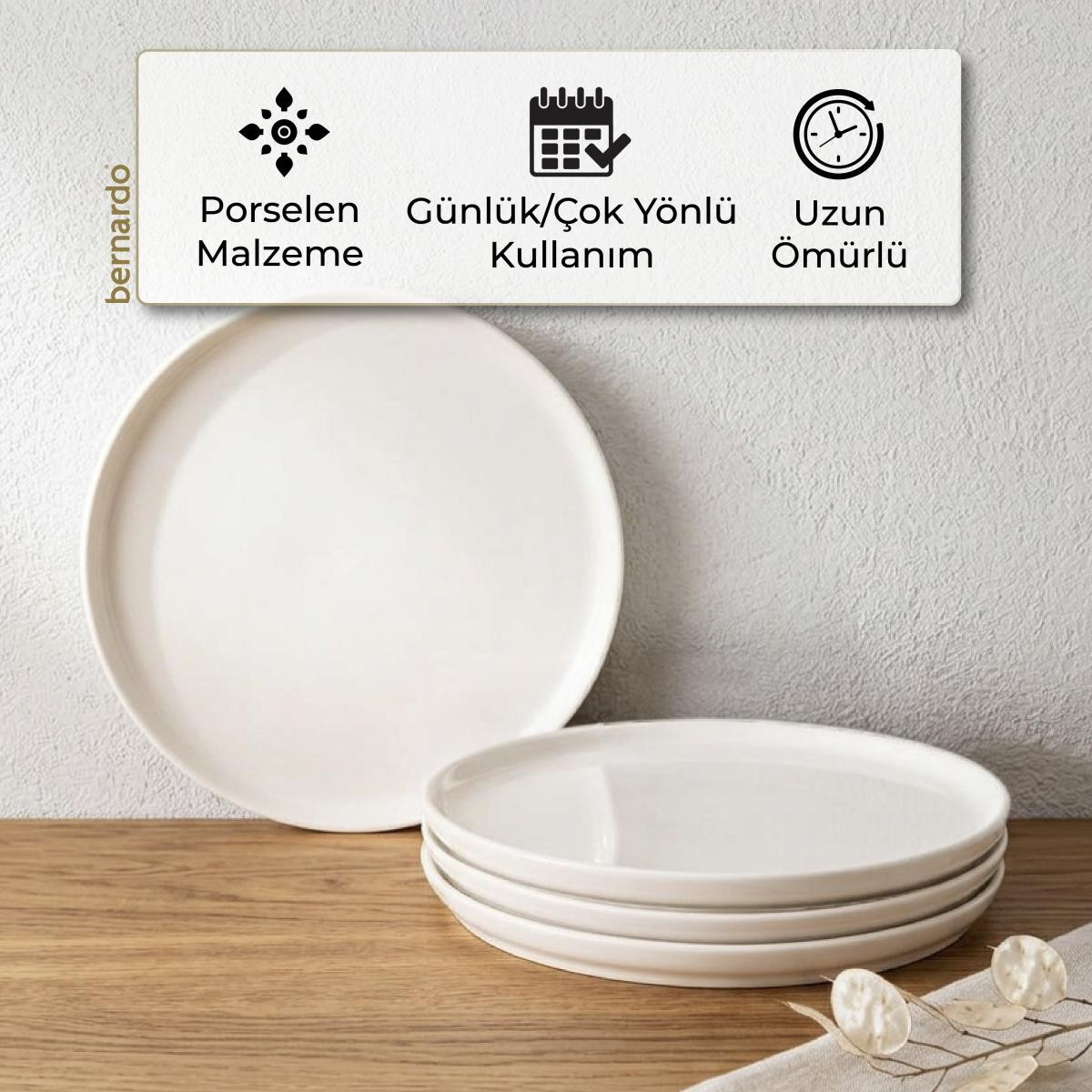 Dış GörünümüBernardo Sade kahvaltı takımı, beyaz porselenin zarifliği ile öne çıkar. Sade ve şık tasarımı, her türlü sofra düzenine uyum sağlar.