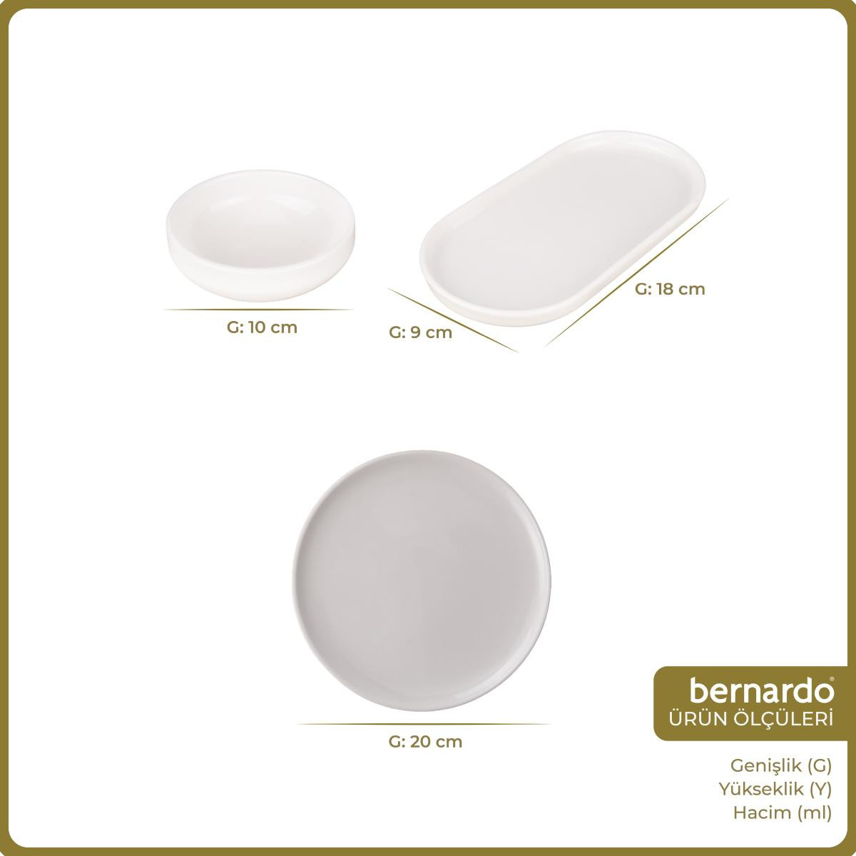 4 adet Pasta tabağı: 20 cm2 adet Kayık tabak: 18x9 cm4 adet Sosluk-reçellik: 10 cm Ürün Detayları ve AçıklamalarıBernardo Sade kahvaltı takımı, yüksek kaliteli porselenden üretilmiştir. Beyaz rengi, sofralarınıza ferahlık ve aydınlık getirir. Sade tasarımı, farklı sofra düzenlemelerine kolayca uyum sağlar. Dayanıklı yapısı sayesinde uzun ömürlü kullanım sunar. Bernardo online satış mağazasından kolayca satın alabilirsiniz.