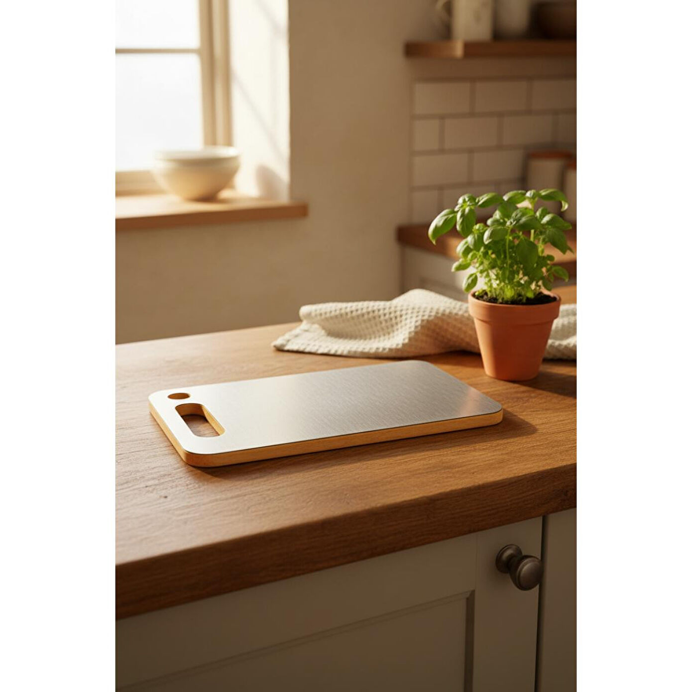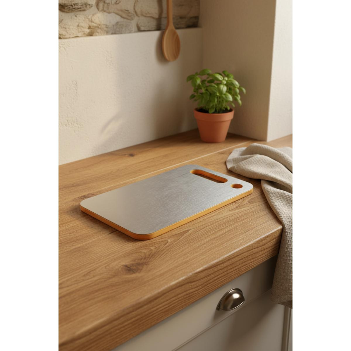 Ürün Özellikleri Marka: Bernardo Model: Stalura Boyut: 24 x 14 cmKalınlık: 1 mm Malzeme: AhşapRenk: Doğal ceviz tonlarında gövde, mat metal yüzeyMalzeme: Doğal Bambu ağacı + paslanmaz çeliz yüzey 304 kaliteÇift Taraflı Kullanım: Evet Fonksiyonları ve Avantajları Çift Taraflı Kullanım: Bir tarafı sebze, diğer tarafı et için kullanılarak çapraz bulaşma riski azaltılır. Küçük Boyut: Az yer kaplar, kolay saklanır. Şık Tasarım: Mutfakta hoş bir görünüm sağlar. Dayanıklı Malzeme: Uzun ömürlü kullanım sunar. Kullanım Alanları ve AmacıHer türlü yiyeceği kesmek, doğramak ve hazırlamak için mutfakta kullanılır. Özellikle küçük mutfaklar için idealdir.