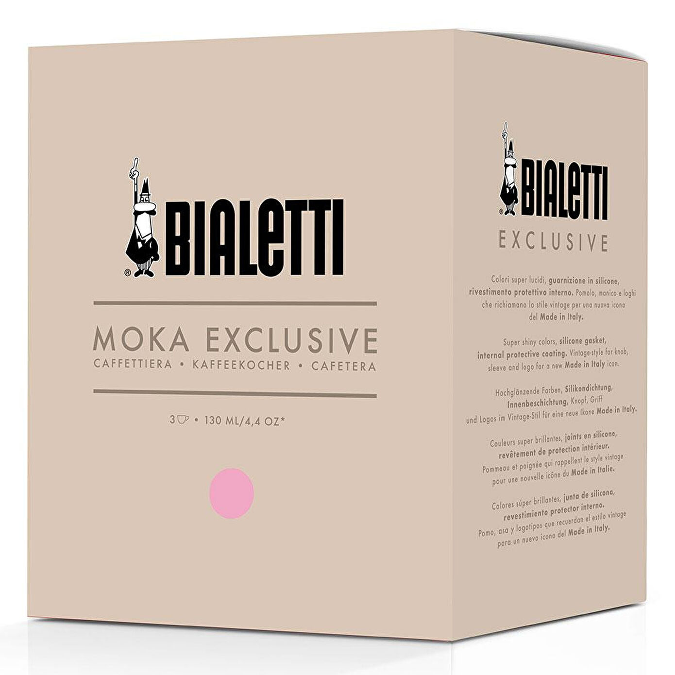 1933’te Alfonso Bialetti’nin tasarımıyla kahve dünyasında devrim yaratan Moka Express, bugün hâlâ İtalya’nın en çok tercih edilen kahve makinesi olma unvanını taşıyor. Moka Exclusive, her ayrıntıya özen gösterilerek yaratılmıştır. Yeni bir İtalyan ikonu için vintage tarzı yüzeyler. Süper parlak renkler, silikon conta ve iç koruyucu kazan astarı. Elmas şeklindeki düğme ve sap, modern ve zarif bir dokunuşla 60'ların Moka'sını hatırlatıyor.
