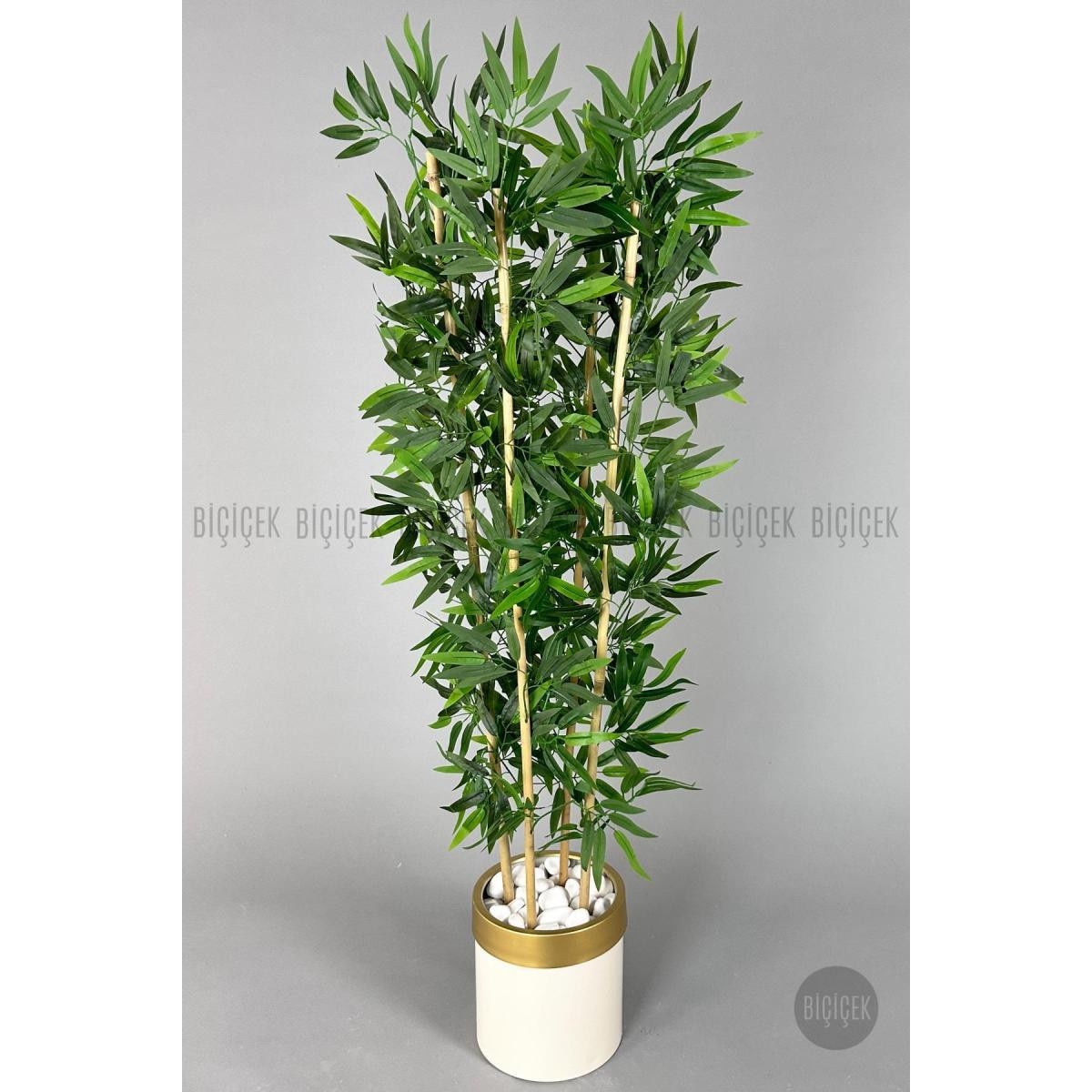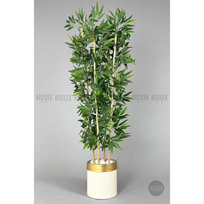 Biçiçek Yapay Bambu Ağacı 140cm Krem Gold Metal Saksıda