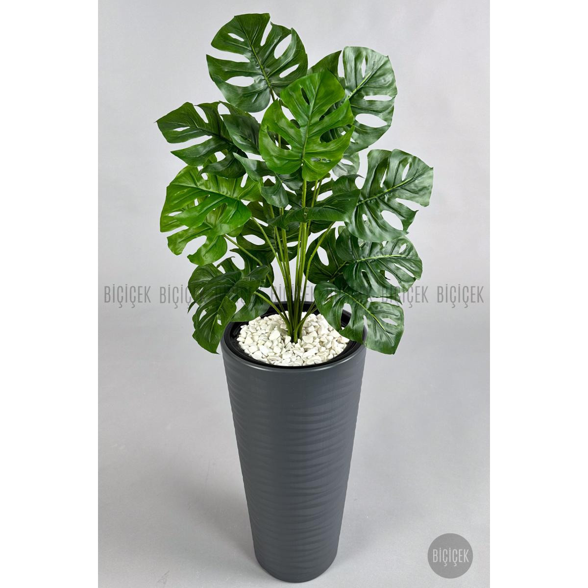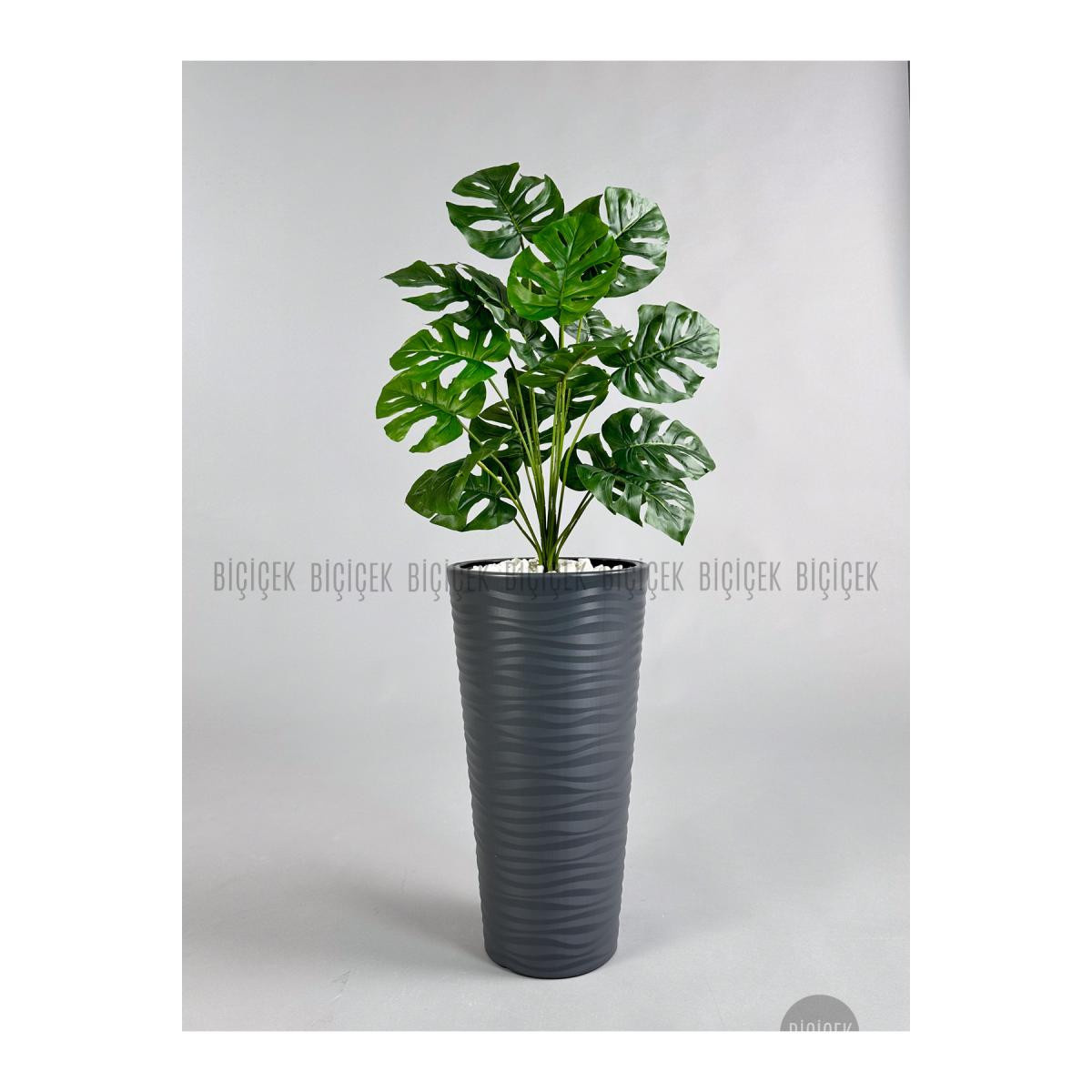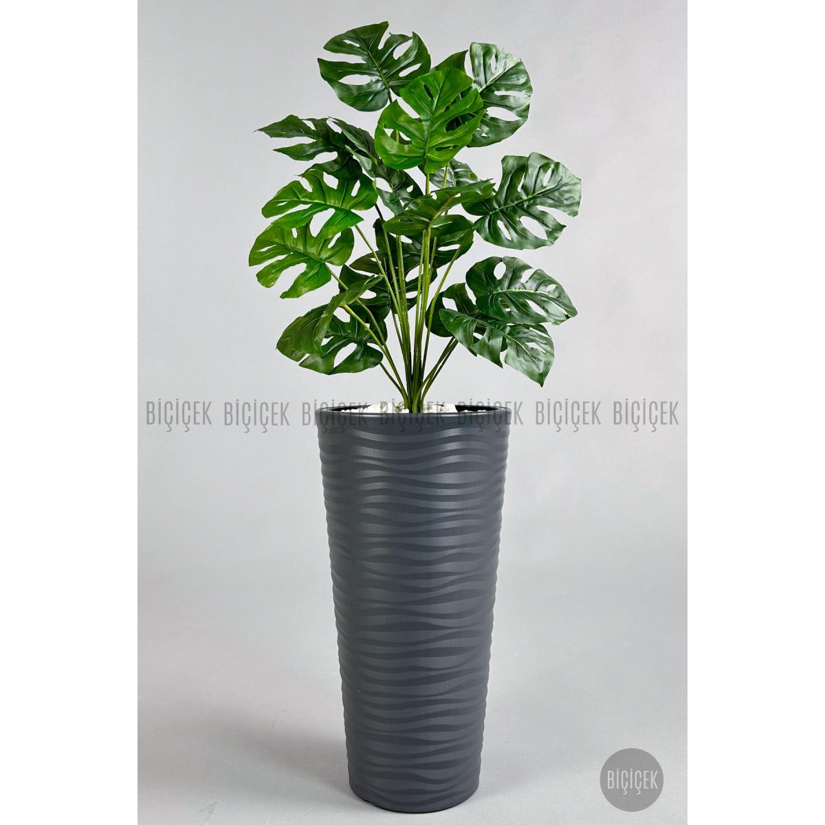 Biçiçek Yapay Çiçek Salon Bitkisi Monstera Deve Tabanı Antrasit Renk Kumsal Saksıda