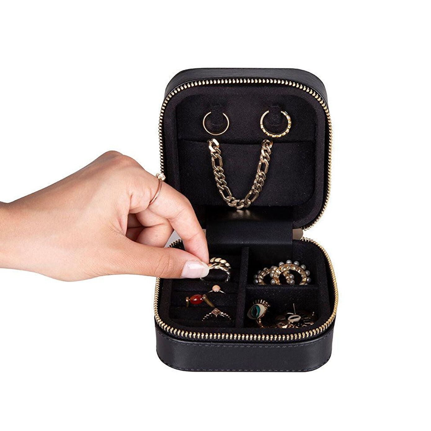 Karışmayan kolye bölmeleri, sabit küpe yuvaları, yüzük ve bileklik haznesi