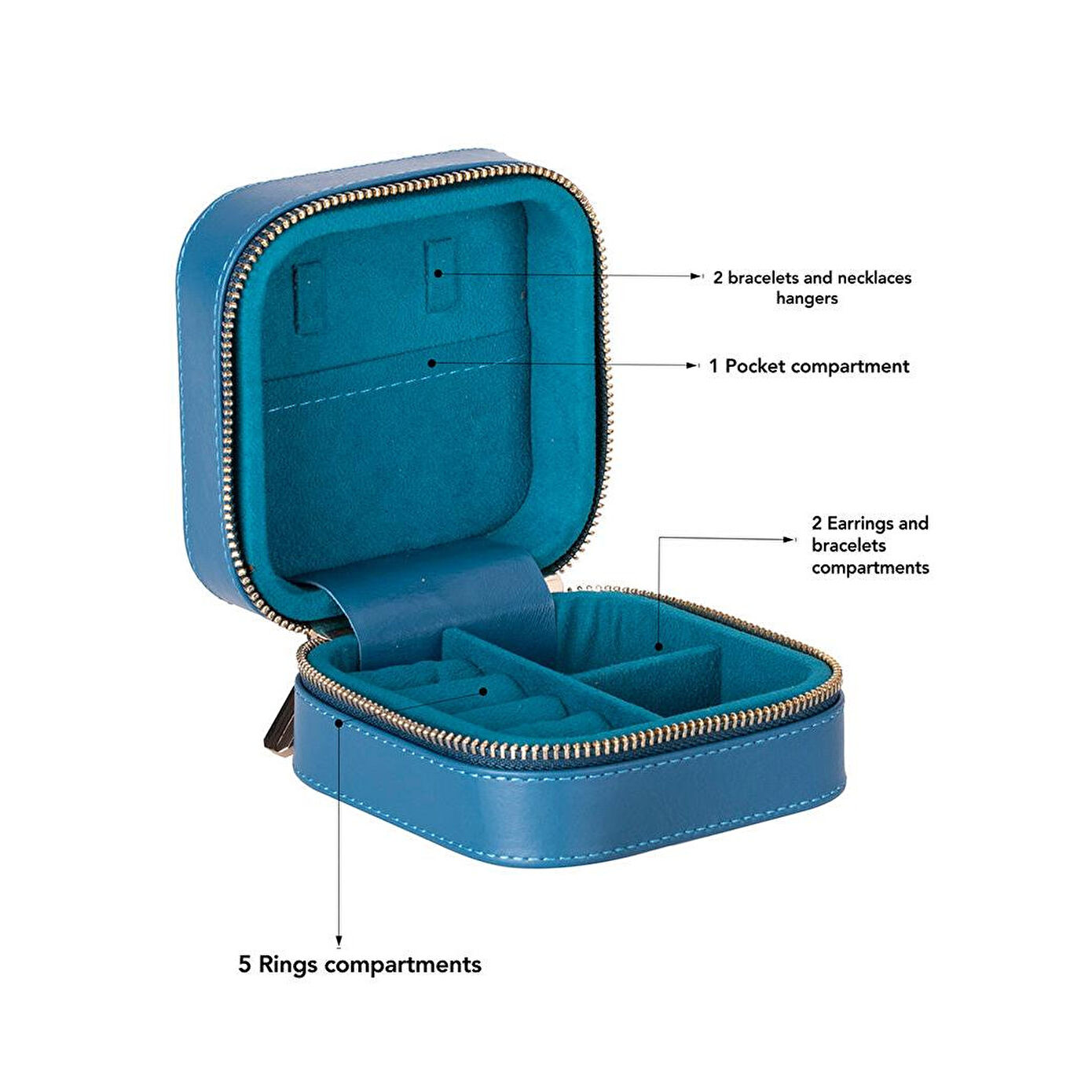 Velvet tonlarında yumuşacık iç astarı sayesinde yüzük, kolye, küpe ve bilekliklerin her biri kendi özel bölmesinde karışmadan ve çizilmeden saklanır. Kompakt yapısı sayesinde hem valize kolayca sığar hem de gündelik yaşamda çantanıza zarifçe eşlik eder.