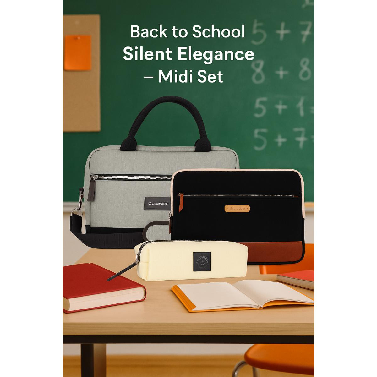 Silent Elegance Midi Set, zamansız sadeliğiyle dikkat çeker. Laptop çantası, Laptop Kılıf ve Kalem Kutusu bir arada; sade şıklığı sevenler için ideal kombin.