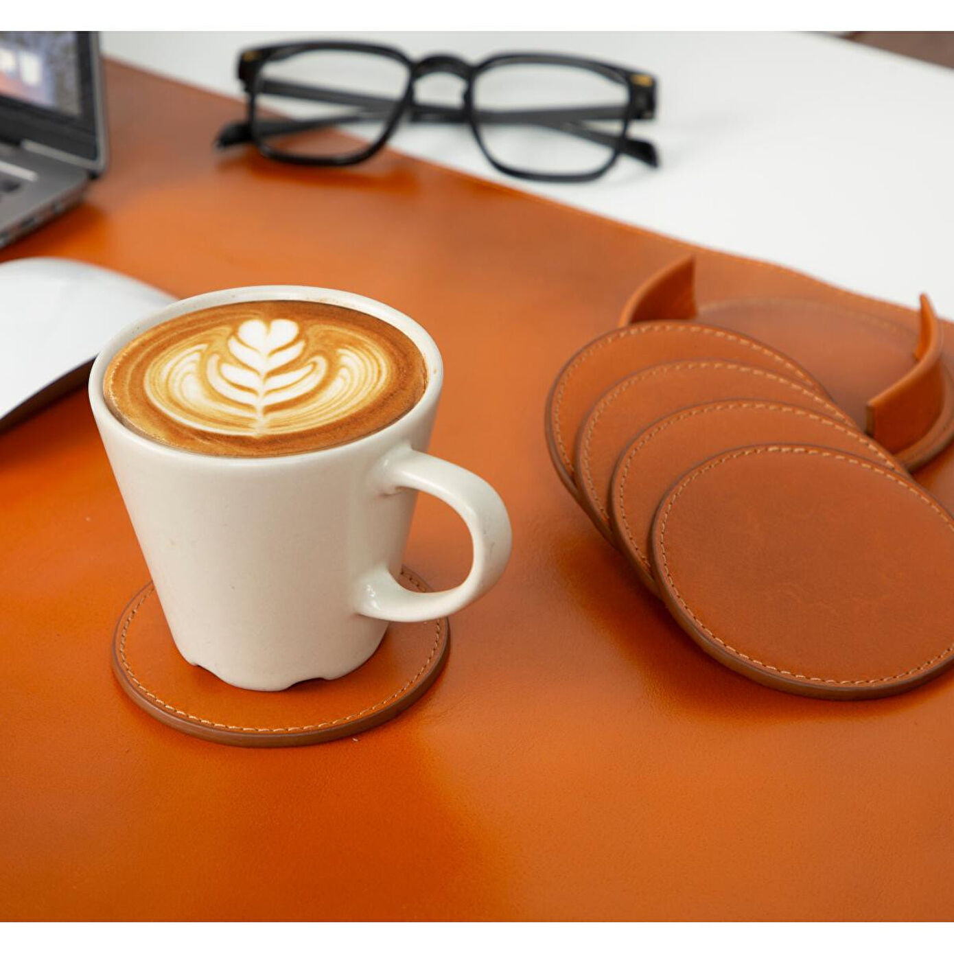Divine Cup Sandy Tan Deri Yuvarlak Bardak Altlığı Seti (5'li)