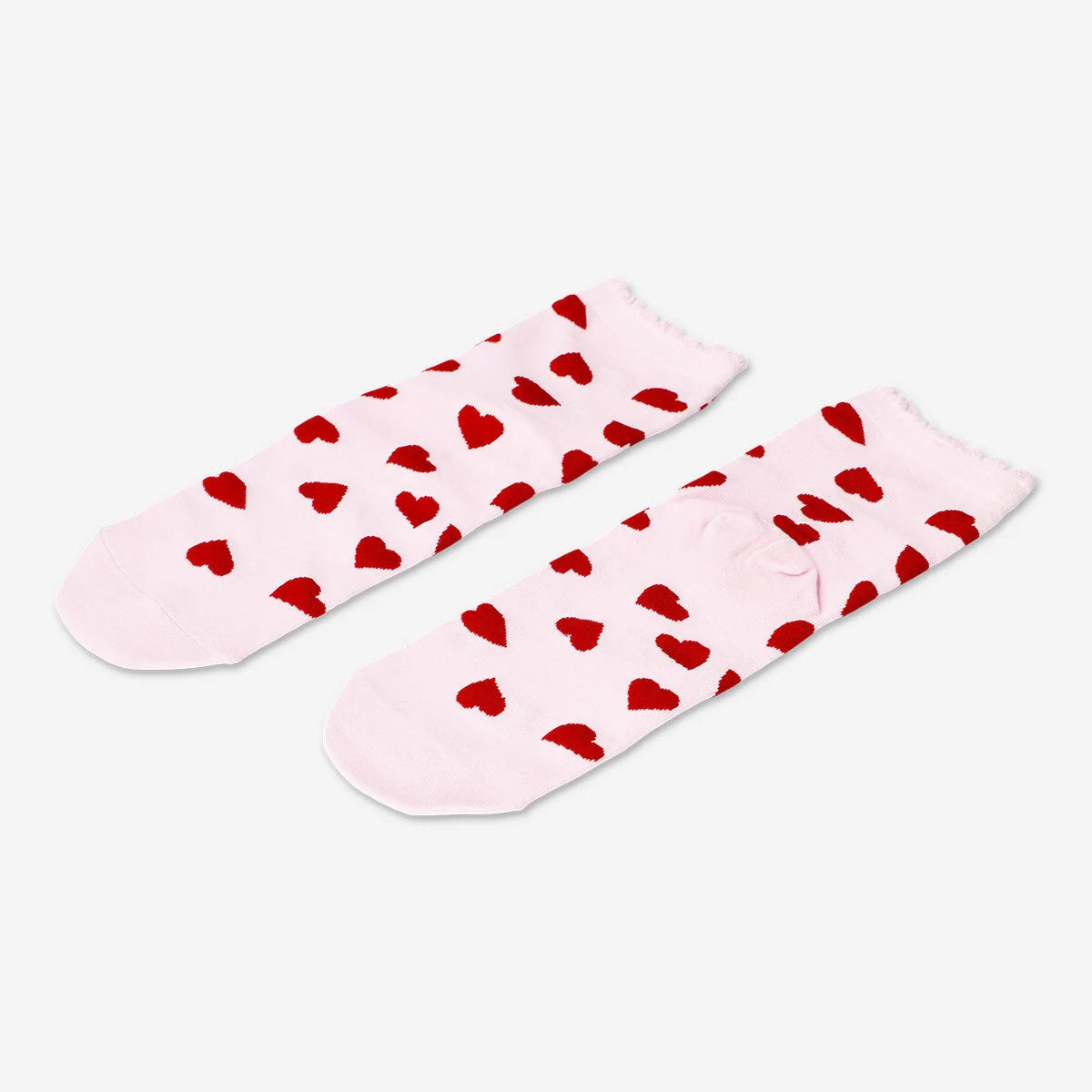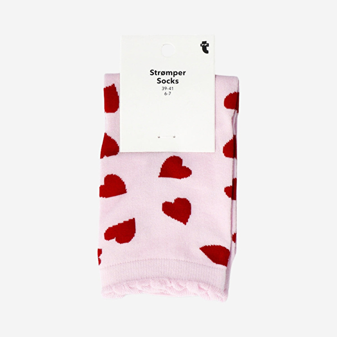 Yumuşak pembe arka plan ve kalp baskısının canlı renkleri, bu çorapları Sevgililer Günü hediyesi veya özel bir tatil aksesuarı olarak harika bir seçenek haline getirir. İster evde dinlenirken ister favori ayakkabılarınızla kombin yaparken, bu çoraplar stilinize neşeli ve çekici bir dokunuş ekler. Gardırobunuza ince ama eğlenceli bir ayrıntı katmak isteyen herkes için mükemmel bir tercihtir.