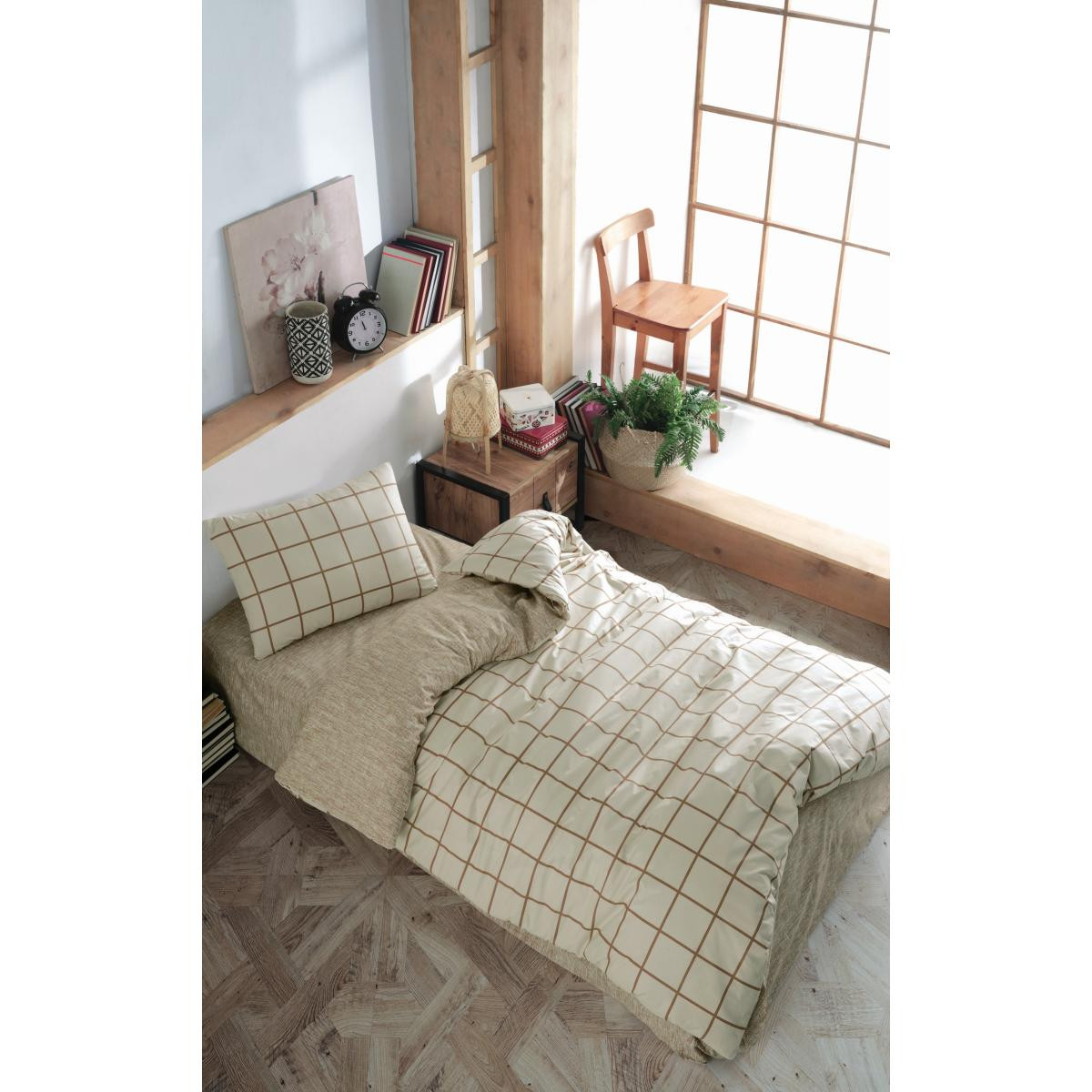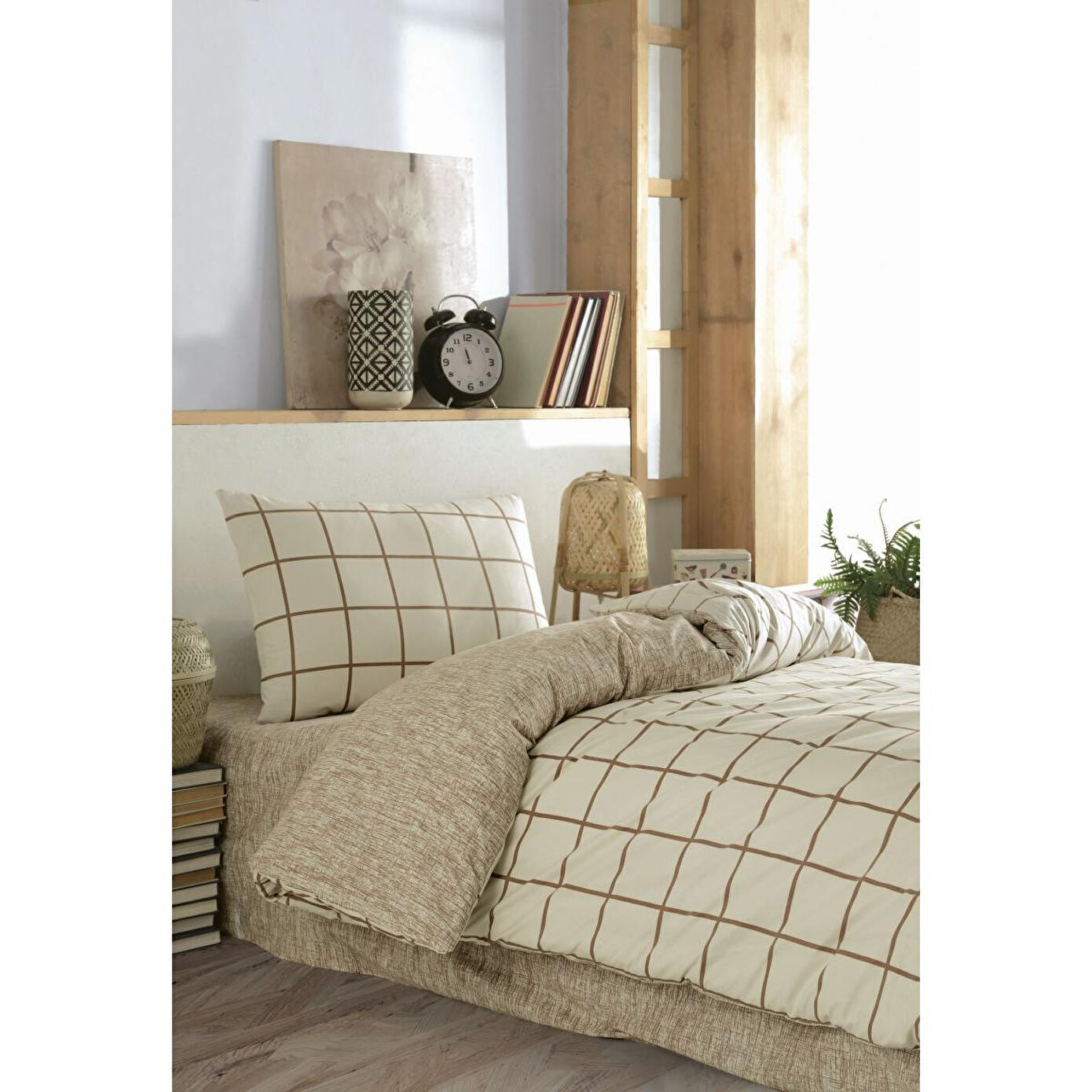 Cozy Home Tek Kişilik Lastikli Çarşaflı Nevresim Takımı Kare Krem