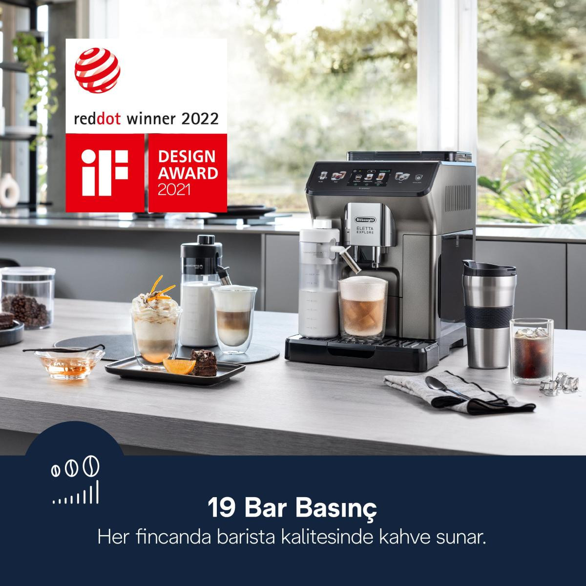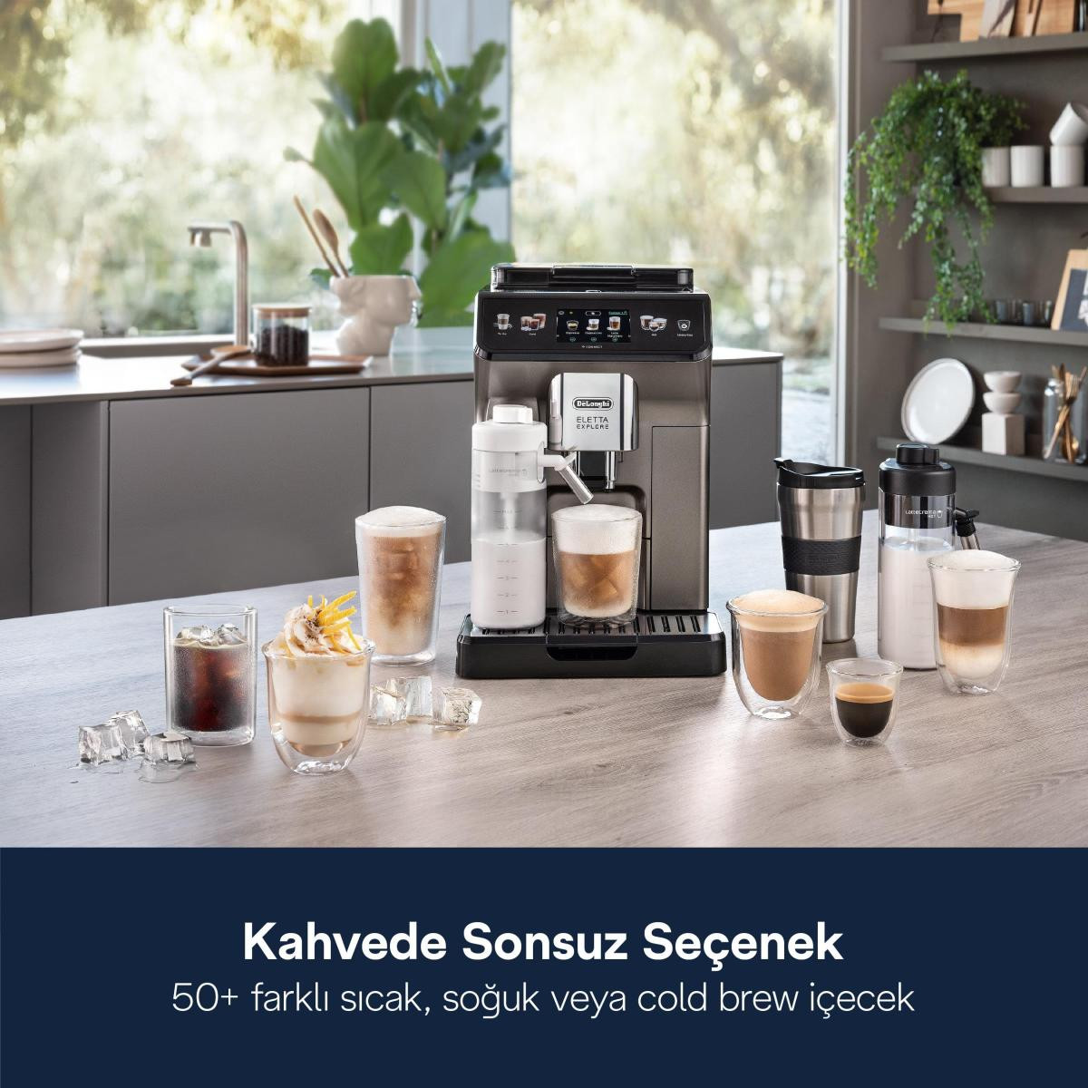Ön kısmı titanyum boyalı De'Longhi Eletta Explore otomatik kahve makinesiyle 50'den fazla sıcak, soğuk ve soğuk demlenmiş içecek. LatteCrema Hot Teknolojisi* sayesinde otomatik sıcak süt köpüğünün, LatteCrema Cool* ve Cold Extraction Teknolojileri ile serinletici soğuk ve Cold Brew kahve içeceklerinin keyfini çıkarın. To-Go işleviyle evde ve hareket halindeyken kendi cafenizins keyfini çıkarın.