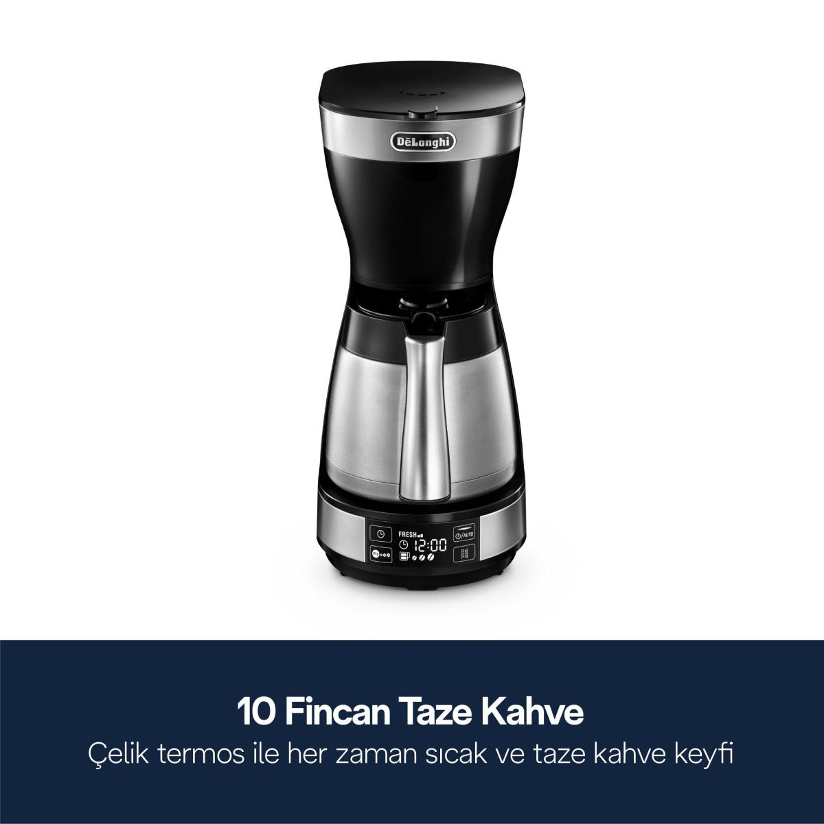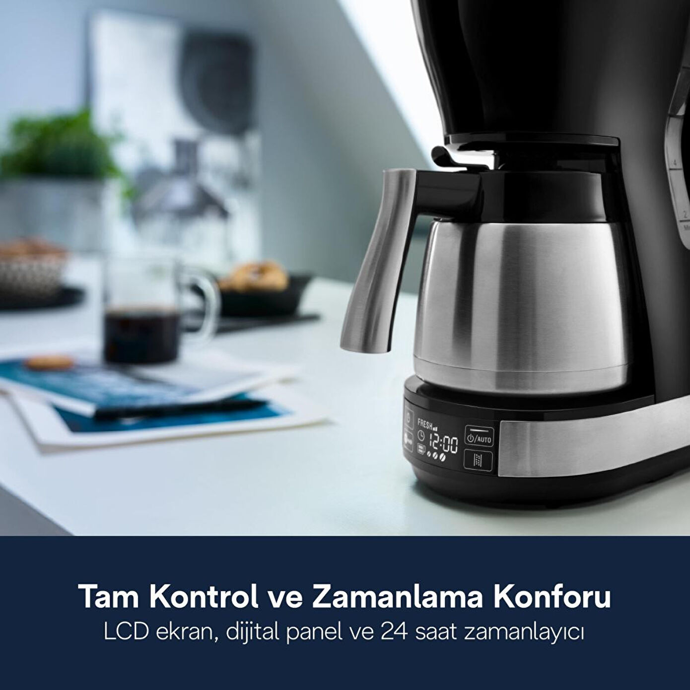 Fincan sayısı: 10 (1,25 I kapasite). Kahvenizi 40 dakikaya dek sıcak tutmak için sürahi ısıtıcı taban. 40 dakika sonra otomatik bekleme fonksiyonu. Damlama önleyici sistem. Su seviyesi göstergesi. Kapalı karaf levhası. V şeklinde çıkarılabilir filtre kullanılabilir. Aroma fonksiyonu. Aroma fonksiyonu (3 seviye). Termal karaf. Yarım veya tam kapasite gösterimi. Kireç çözme uyarısı. Entegre 24 saat Zamanlayıcı/Saat. Tazelik göstergesi. Dokunmatik düğmeli LCD ekran. Paslanmaz çelik şeritlere sahip siyah plastik gövde.
