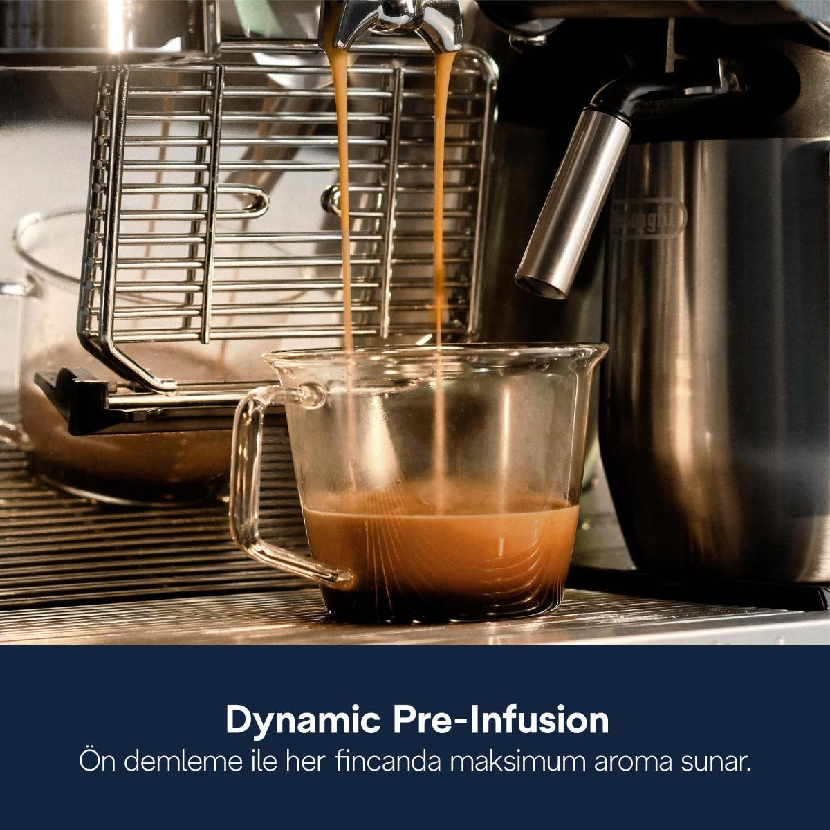 "De'Longhi'nin teknolojileri sayesinde mükemmel kahve ekstraksiyonuna ulaşın. Makine, seçtiğiniz çekirdek türüne uyum sağlamak için 8 öğütme ayarı ve 5 demleme sıcaklığı profiline sahiptir ve dinamik ön demleme, uzunluğu öğütmenin yoğunluğuna göre ayarlar. "