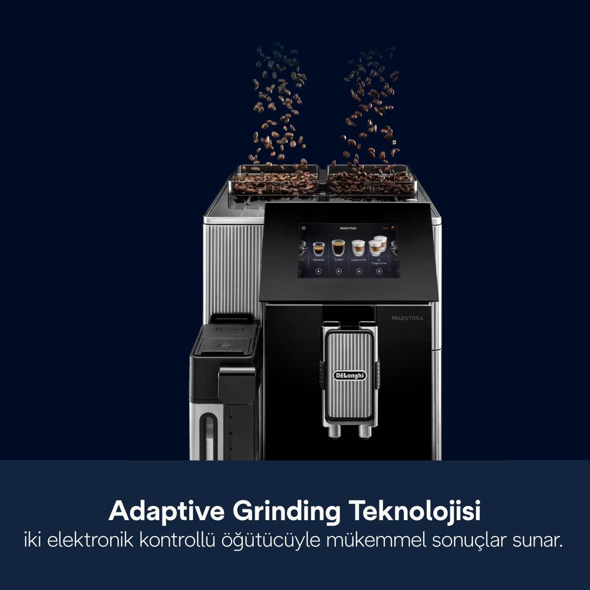 En iyi lezzet için Adaptive Grinding Teknolojisi, elektronik olarak kontrol edilen hassas öğütme: 2 öğütücü ve yeni elektronik kontrol, her kahve hazırlayışınızda hassas ve tutarlı öğütmeyi ve kalıcı performansı garanti eder. Daha kişisel bir kahve deneyimi için bağımsız çekirdek kapları: kullanıcı, ekrandan, içeceğini hazırlamak için hangi kahve çekirdeği tipini kullanacağını seçebilir. Hareketli kola sahip yeni LatteCrema System termal karaf sayesinde, kullanıcılar tek seferde iki sütlü içecek hazırlayabilir. Dahası, süt köpüğü ekrandan kolayca ayarlanabilir. Maestosa, özgün İtalyan Espresso’sundan Cappucciona’ya, Flat White’a hatta Soğuk Kahve (MixCarafe sayesinde) ve 2 kişilik servis edilen içecek seçkisi dahil birçok tarifi tek dokunuşla hazırlayabilir. Çığır açan tasarım ve yenilikçi yüzeyler: Kullanıcılar zarif şeritli paslanmaz çelik gövdenin, ultra aynalı paslanmaz çelik üst kapağın ve parlak siyah cam ön panelin keyfini yaşayabilir. Maksimum kullanım kolaylığı ve etkileşim için 5” tam dokunmatik TFT renkli ekran ve Coffee Link Uygulaması.