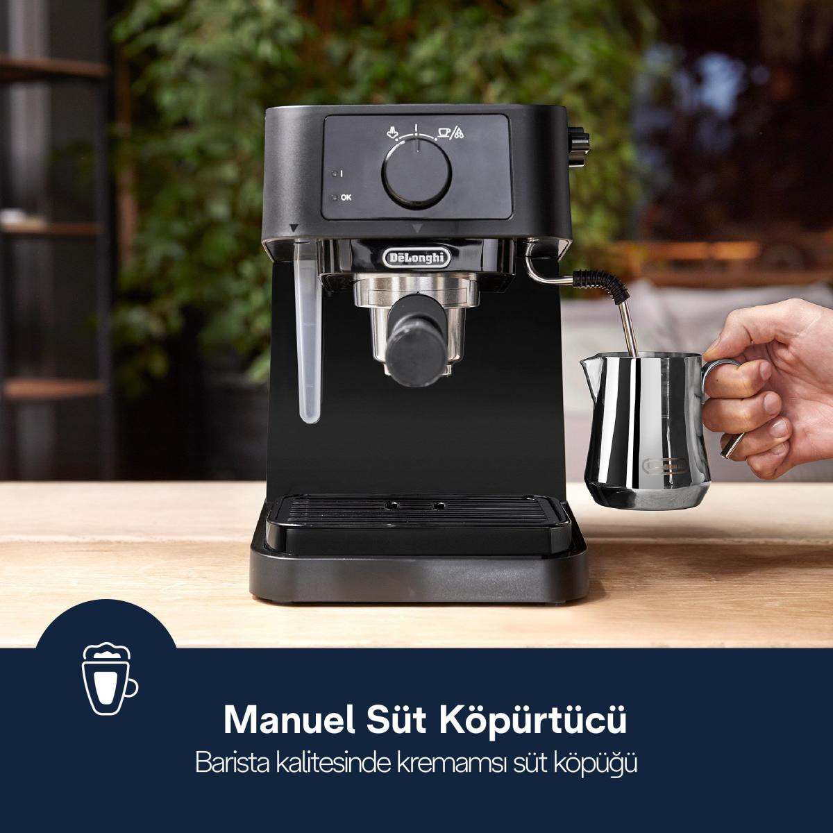 En sevdiğiniz karışımı seçin ve mükemmel bir krema ile kendi espressonuzu hazırlayın. Paslanmaz çelik süt köpürtücü ile çok çeşitli süt bazlı içecekler hazırlayın Çıkarılabilir damlama tepsisi, kupanız için 110 mm'ye kadar ekstra alan sağlar Kolay tutuş sağlayan kaplamalara sahip kompakt ve modern tasarım