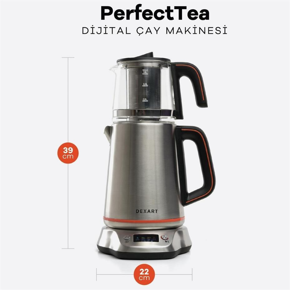 PerfectTea Dijital Çay Makinesi, paslanmaz çelik gövdesiyle uzun ömürlü ve dayanıklı bir kullanım sunar. Cam demlik, demleme sürecini kolayca izlemenizi sağlayarak her zaman mükemmel çay hazırlamanıza yardımcı olur.