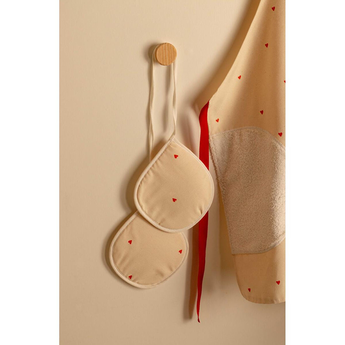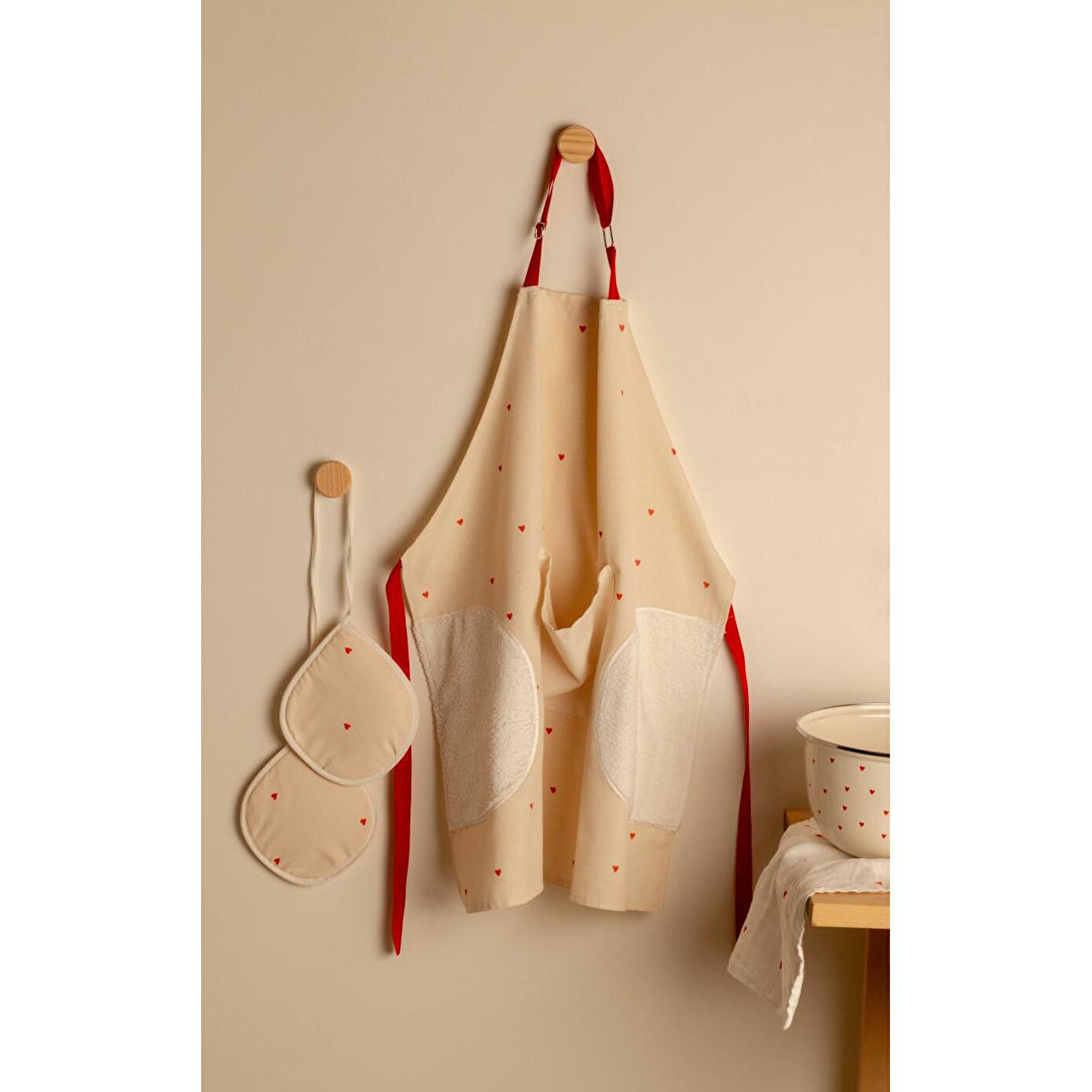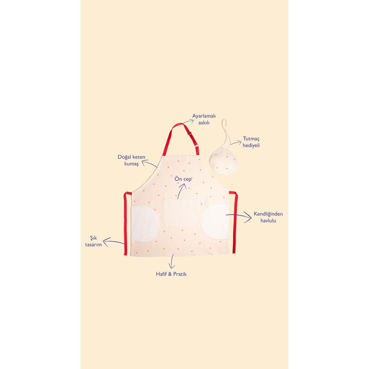Emaylab Cupid Kalpli Mutfak Önlüğü ve Eldiven Seti | Krem Rengi Havlulu Önlük