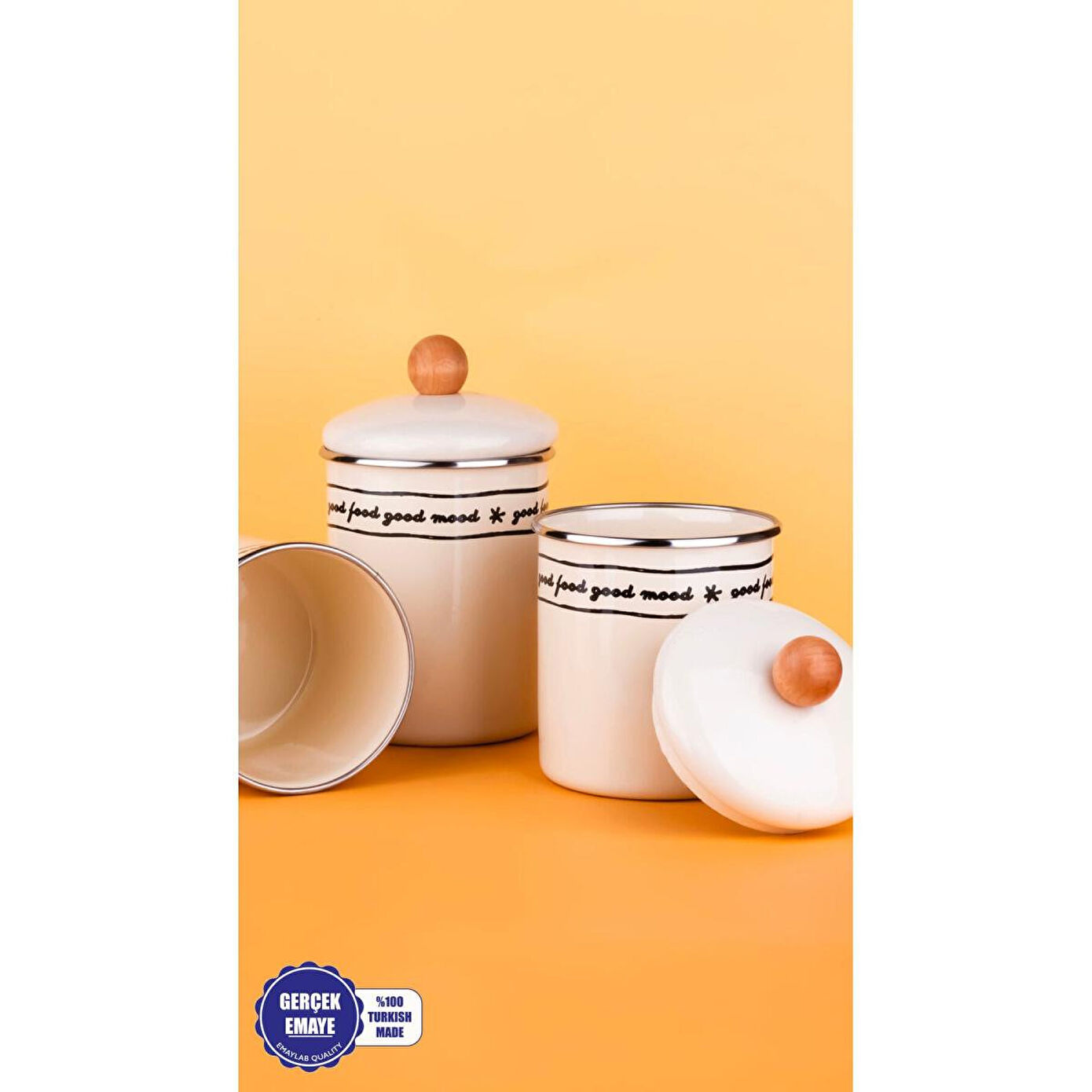 Emaylab Mood Ahşap Tepeli Emaye Kavanoz/Baharatlık Seti ; Mood serisinin en gözde parçalarından birisi kavanozlarımız, mutfağınıza sıcaklık katacak. Ömür boyu desen garantisiyle de sevdiklerinize kendinizi hatırlatmak için harika bir hediye seçeneği olabilir. ; Emaye sağlıklıdır. Renkleri özel baskılıdır solmaz. ; Ürünlerimiz el işçiliği ile üretilmektedir. ; Yüzeyinde el üretiminin doğasından ortaya çıkan farklılıklar nedeniyle her ürün benzersizdir ve tek tek kalite kontrolü yapılmaktadır. ; Tüm ürünlerimiz makinede yıkamaya uygundur fakat daha uzun kullanım için elde yıkayıp, el bezi ile kurulamanızı öneririz. ; Her zaman tahta veya silikon kaşıkla kullanmalı, çizilmeyecek şekilde temizlemelisiniz. ;
