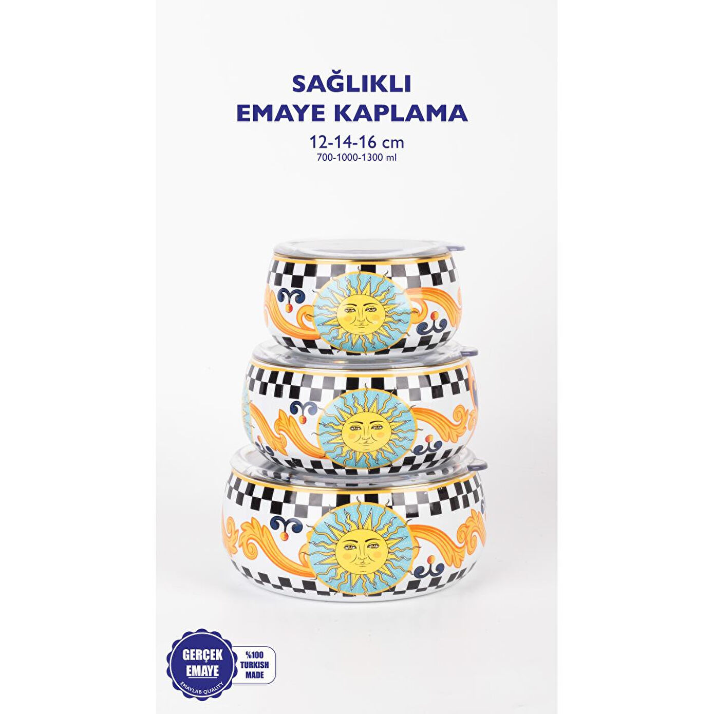 Emaye Tombul Saklama Kabı Takımı ; Ürün Ölçüleri: ; Üst çapı: 12 cm - 14 cm - 16 cm ; Yükseklik: 7 cm - 7,5 cm -8 cm ; Hacim: 700ml/1000ml/1300ml ; Emaye sağlıklı ve pürüzsüz bir metaryeldir, kolay yıkanır. ; Desenleri özel ipek baskıyla üretilmiş olup uzun akmaz ve çıkmaz. ; Ürünlerimiz el işçiliği ile üretilmektedir. ; Yüzeyinde el üretiminin doğasından ortaya çıkan farklılıklar nedeniyle her ürün benzersizdir ve birbirleri arasında hafif farklar olabilir. ; Tüm ürünlerimiz makinede yıkamaya uygundur fakat daha uzun kullanım için elde yıkayıp, el bezi ile kurulamanızı öneririz. ; Her zaman tahta veya silikon kaşıkla kullanmalı, çizilmeyecek şekilde temizlemelisiniz. ;