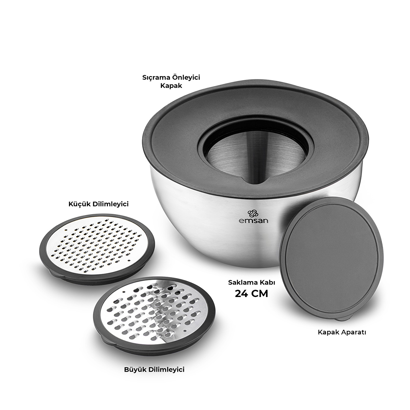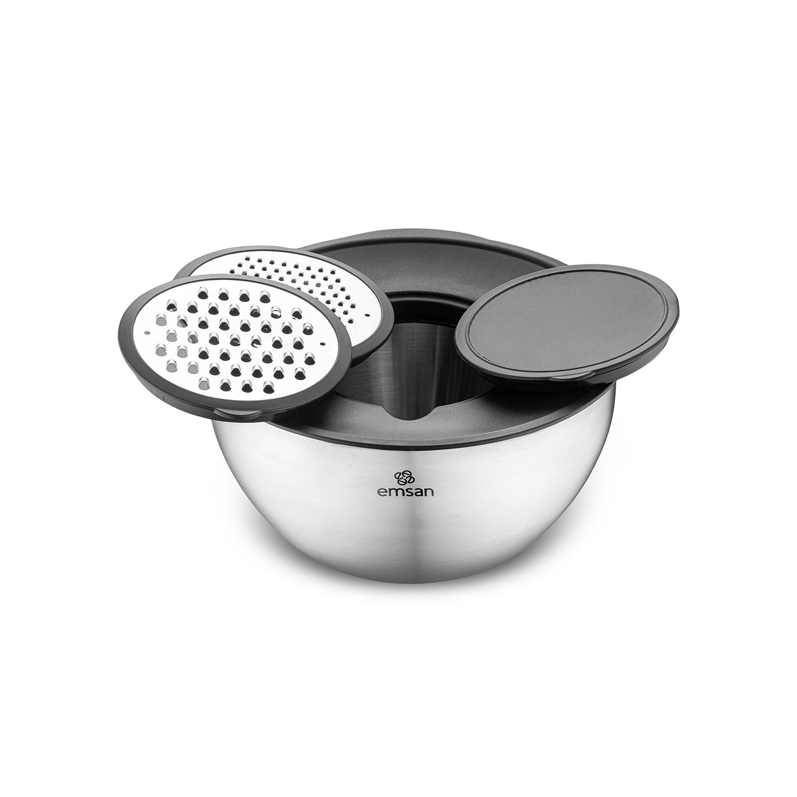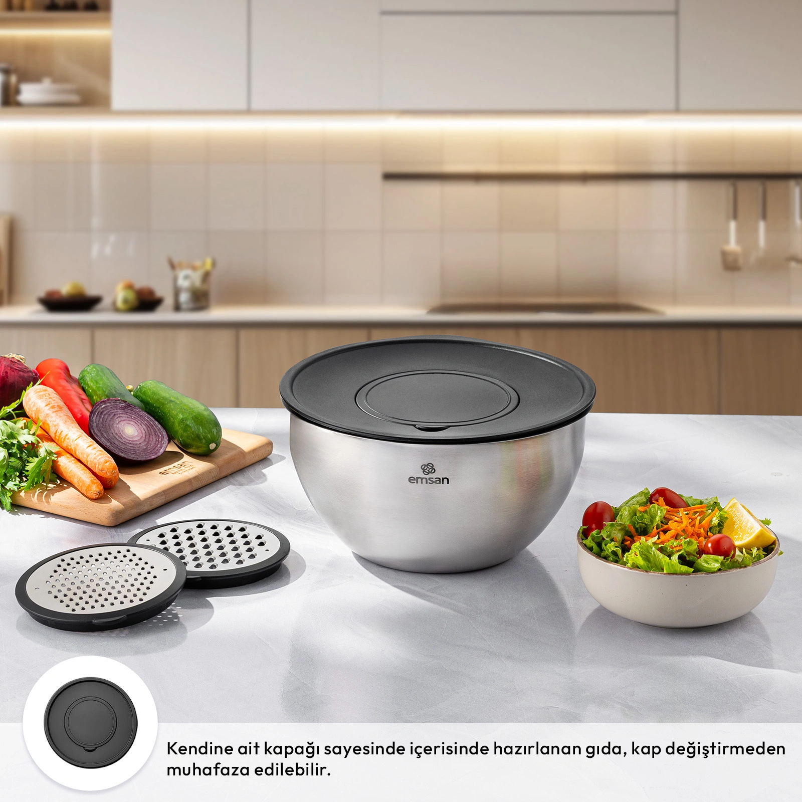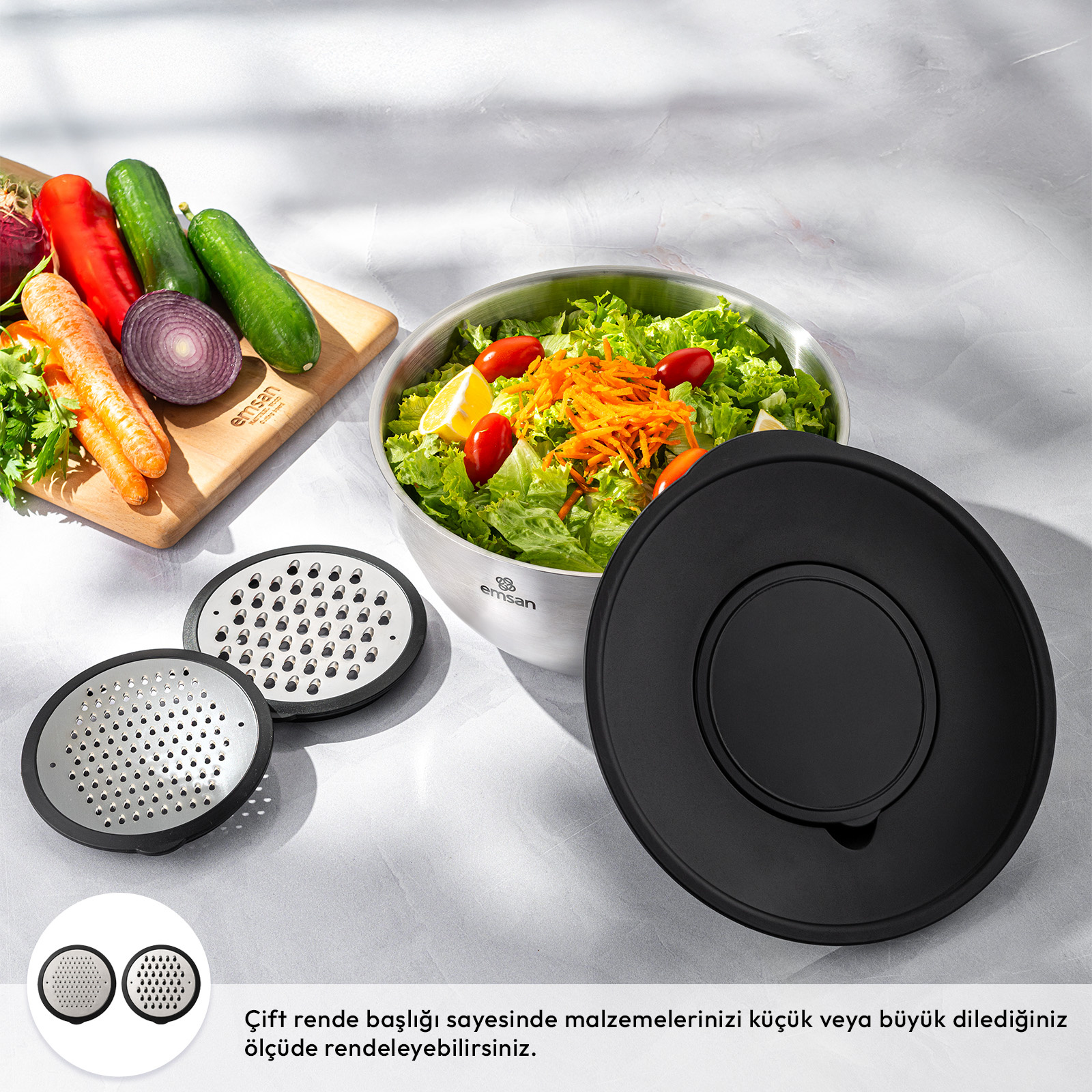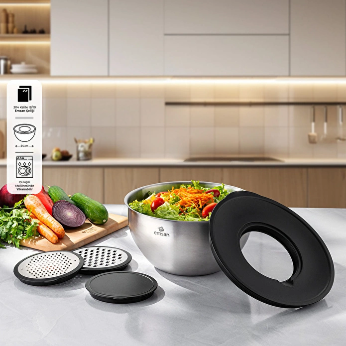 Paslanmaz çelikten üretilmiş çok amaçlı karıştırma ve saklama kabı olan Demre 3 in 1, bir ürün ile 3 ayrı özellik sunmaktadır; rendeler, karıştırır, saklar.