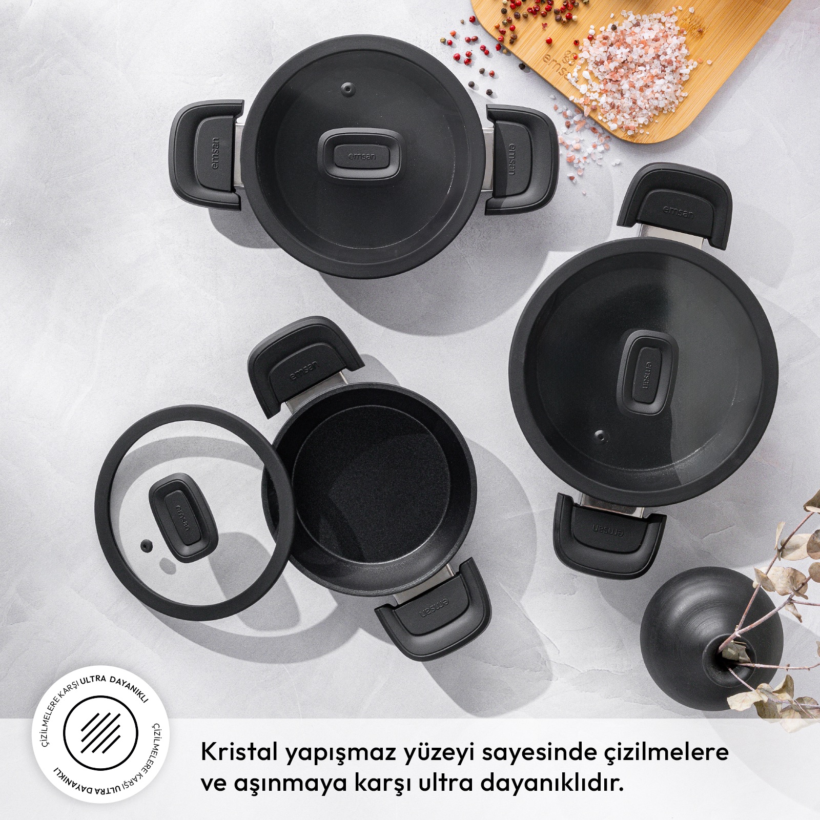 Emsan Diamente, gücünü ve sağlamlığını doğanın en dayanıklı harikası gerçek elmas kristallerinden alır. Ultra dayanıklılık ve çizilmezlik özelliği sayesinde metal mutfak gereçleri ile de güvenle kullanılabilir. Üstün yanmaz yapışmaz yüzeyi ile et, balık, yumurta ve sebzeleri yağ kullanmadan sağlıklı bir şekilde pişirmeye olanak sunar. Isıyı her tarafa eşit olarak dağıtması sayesinde yemeklerin daha lezzetli pişmesini sağlar
