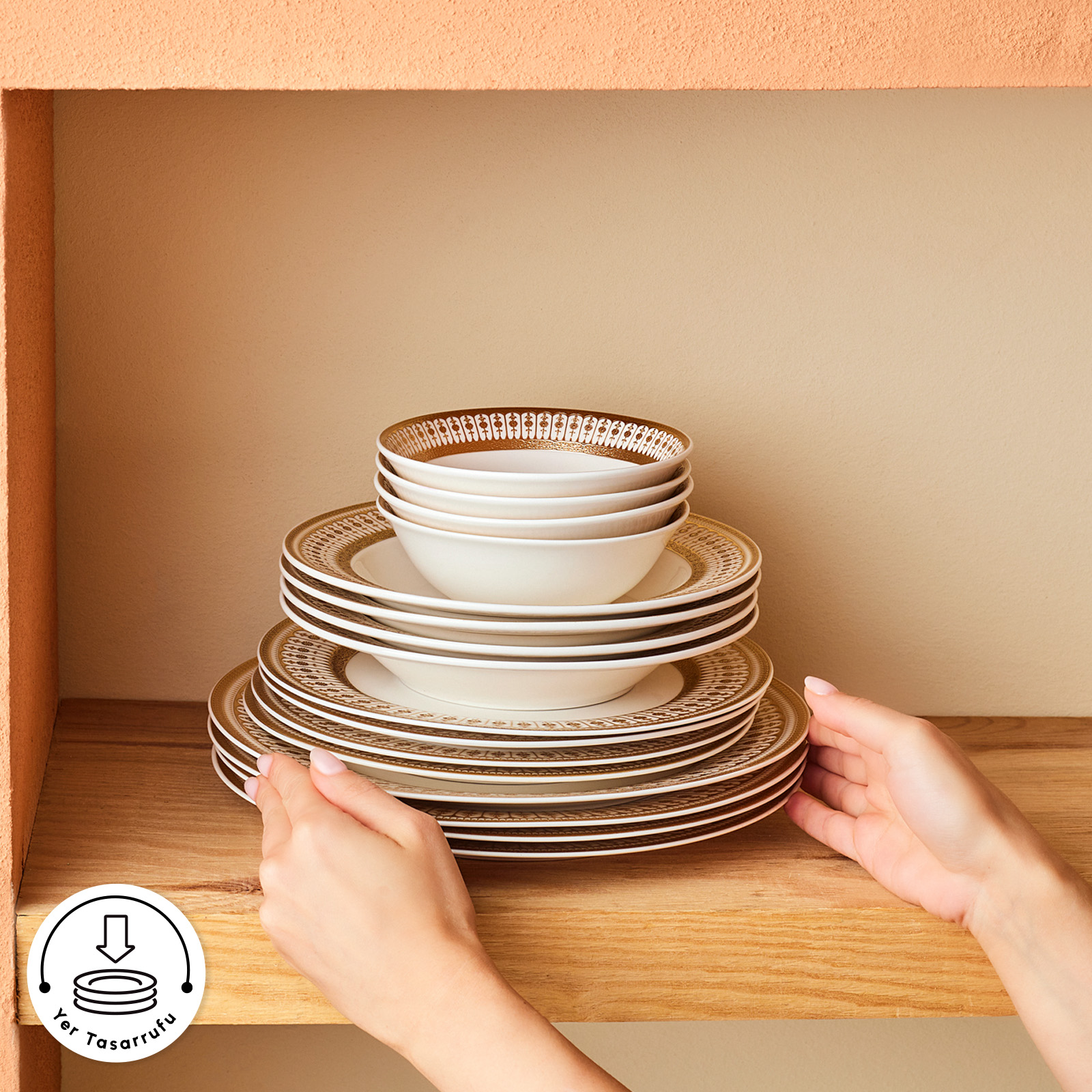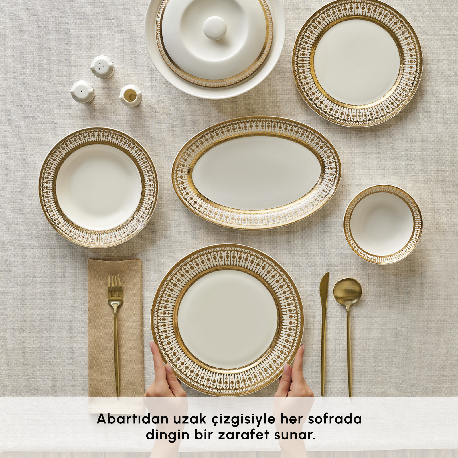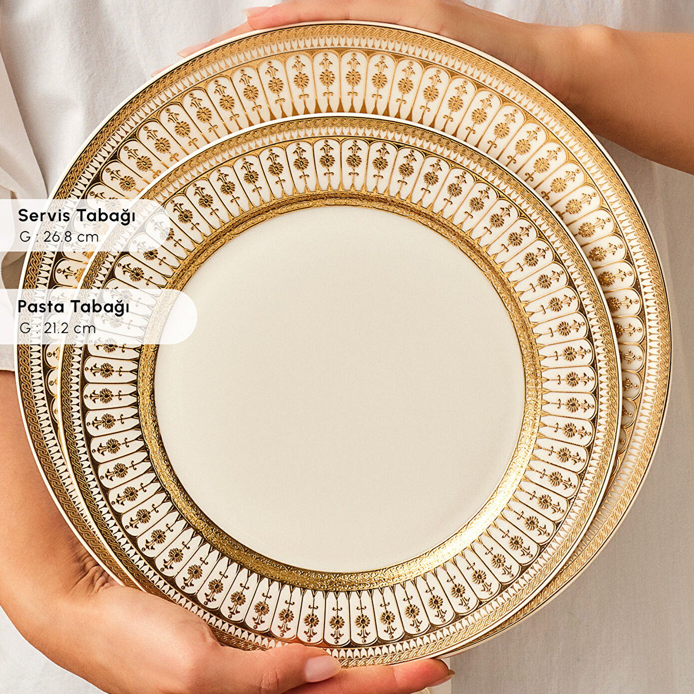 Beyaz Zemin + Sıcak Altın Tonu : Empire Bone’un en dikkat çeken detaylarından biri, saf beyaz zemin üzerine kullanılan sıcak altın tonudur. Beyazın ferahlığı, altının ışıltısını daha güçlü yansıtır; sonuç ise sofistike, aydınlık ve lüks bir görünüm olur. Özellikle ışık altında altın detayların yansıması, sofraya göz alıcı bir zarafet katar.