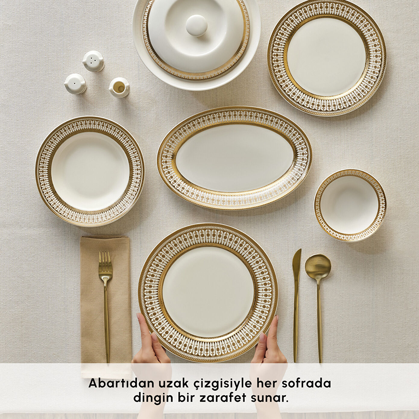 Görkemli detayları modern zarafetle buluşturan Empire Bone Yemek Takımı, sofralarda güçlü bir “ilk izlenim” yaratmak isteyenler için tasarlandı. Tasarımın merkezinde yer alan yoğun bordür çizgisi, tabaklara adeta bir çerçeve etkisi kazandırarak her sunumu daha düzenli, daha dikkat çekici ve daha şık gösterir.