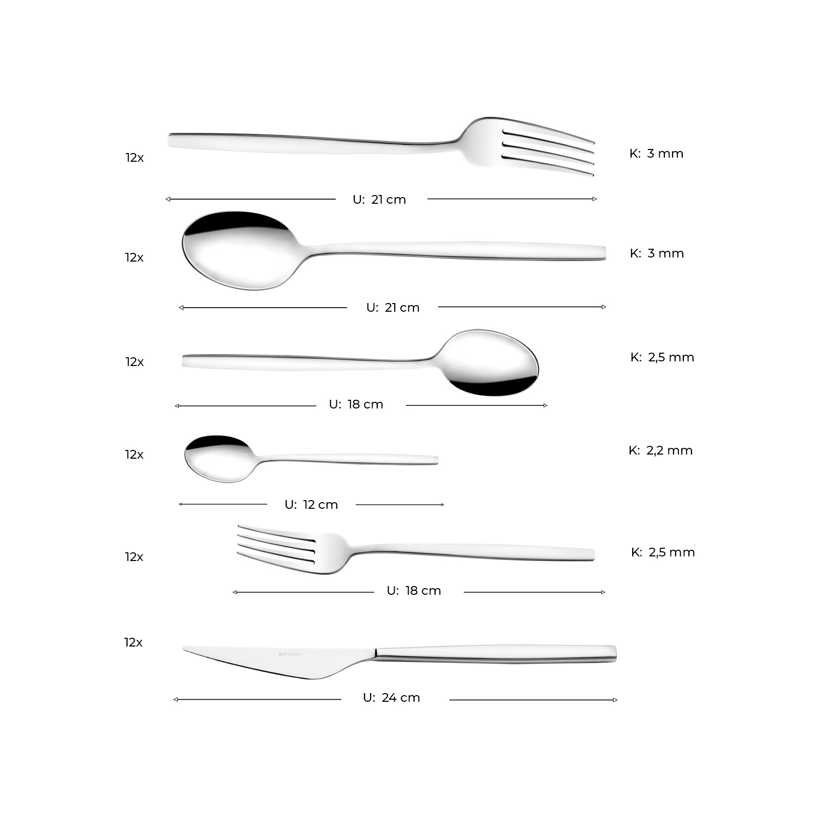 - 12 Adet Yemek Kaşığı (21 cm) 3mm