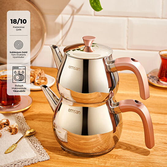 Emsan Pera Çaydanlık Takımı, 1 litre kapasiteli demliği ve 1,6 litre kapasiteli su haznesi ile çay keyfiniz için mükemmeldir. Çelik yapısından gelen üstün ısı iletimi sayesinde lezzetli çaylar demleyebilir, sağlıklı ve uzun ömürlü kullanımın keyfini çıkarabilirsiniz.