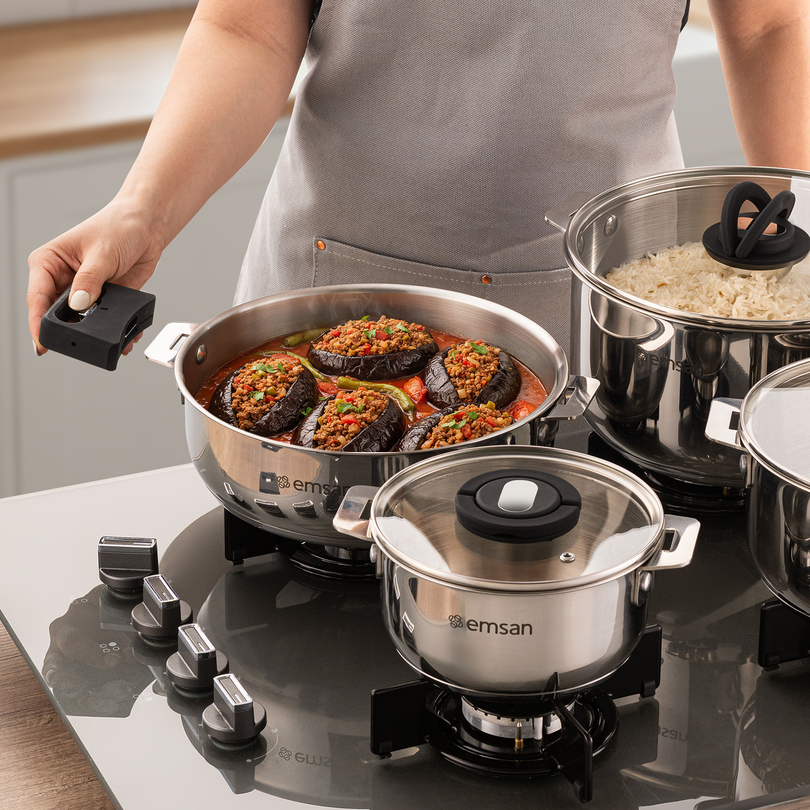 Tak çıkar kulplarla sosluk, tava ve tencere olabilir.