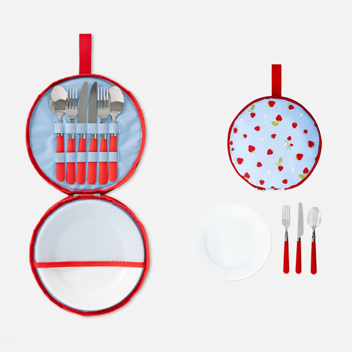 2 Kişilik Çantalı Tabak ve Çatal Kaşık Bıçak Seti, açık hava yemekleriniz için mükemmel bir seçimdir. 34 x 4 x 25 cm boyutlarındaki yuvarlak çanta, eğlenceli bir çilek deseniyle tasarlanmış olup piknik malzemelerinizi düzenli ve şık bir şekilde taşır. Çanta içinde, her şeyin yerinde kalması için elastik kayışlarla düzgünce saklanmış iki kişilik tabak ve çatal bıçak takımı bulunur.
