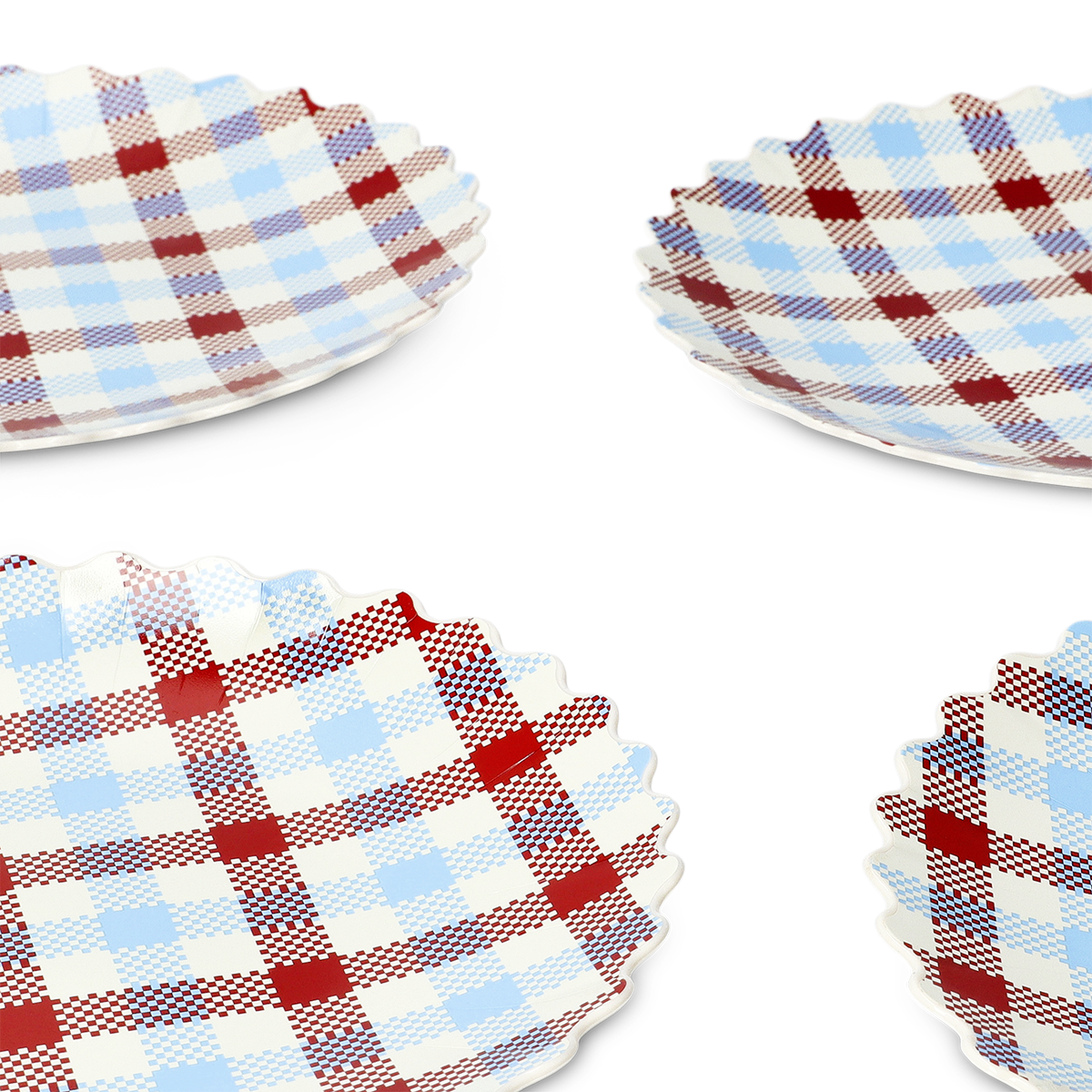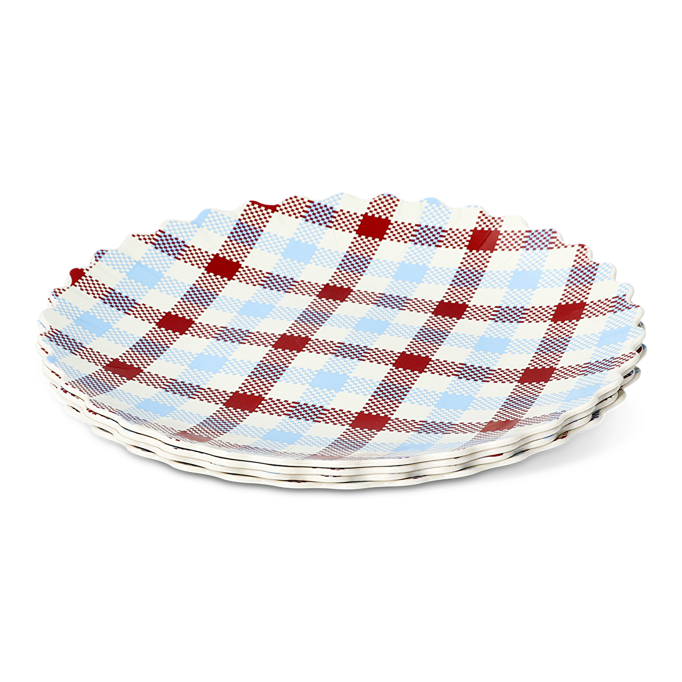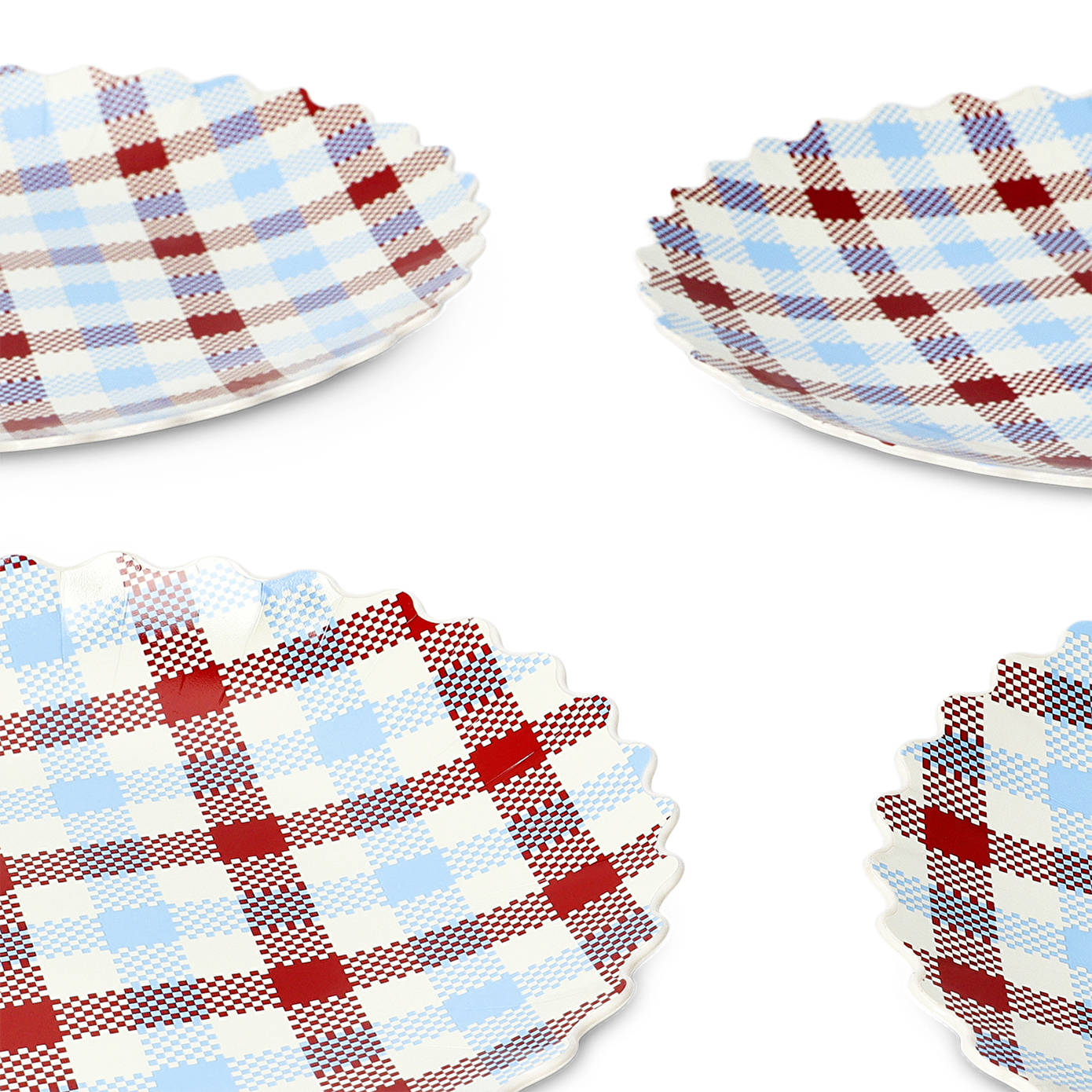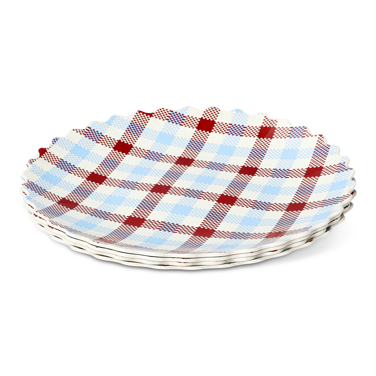 4'lü Kareli Plastik Tabak ile açık hava toplantılarınıza büyüleyici bir dokunuş katın. Bu set, her biri 22,5 x 1,8 x 22,5 cm boyutlarında, klasik kareli desen ve dalgalı kenarlara sahip dört adet çok renkli tabaktan oluşur. Hafif plastik malzeme, bu tabakların taşımasını kolaylaştırır ve piknikler, barbeküler veya gündelik partiler için mükemmeldir.
