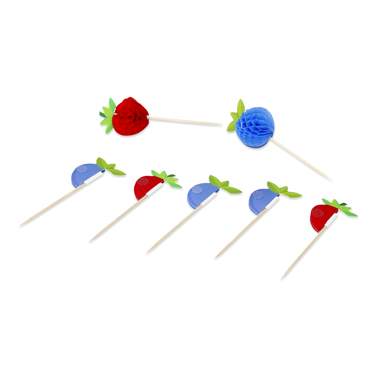 8'li Kırmızı Meyve Detaylı Kürdan ile parti atıştırmalıklarınızı şık bir şekilde sunun. Her biri çilek ve mavi dut şeklinde tasarlanmış olan bu dekoratif çubuklar, tatlılar, kekler veya peynir tabakları gibi ikramlara neşeli ve şenlikli bir hava katar. 11,4 x 4 x 4 cm boyutlarındaki bu kürdanlar, yiyeceklerinizi şık bir şekilde sunarken, masanıza canlı renkler ve eğlenceli bir hava ekler.