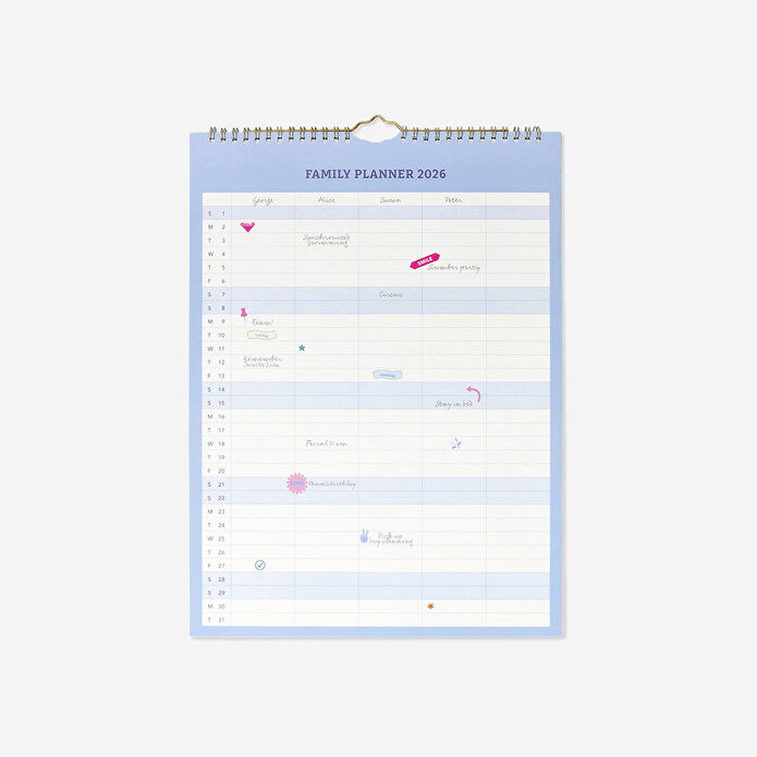 Yumuşak pastel tonlardaki tasarımı, fonksiyonellikle estetiği birleştirir ve mutfak, koridor veya çalışma alanları için ideal bir dekoratif parça oluşturur. 2026 boyunca aile üyelerinin programlarını organize etmek için merkezi bir yere asabileceğiniz bu takvim, günlük hayatın karmaşasında düzeni ve verimliliği sağlamaya yardımcı olur. Eğlenceli ve şık tasarımıyla Aile Planlayıcılı Mavi 2026 Duvar Takvimi, her aile için güvenilir ve ilham verici bir planlama aracı olarak öne çıkar.