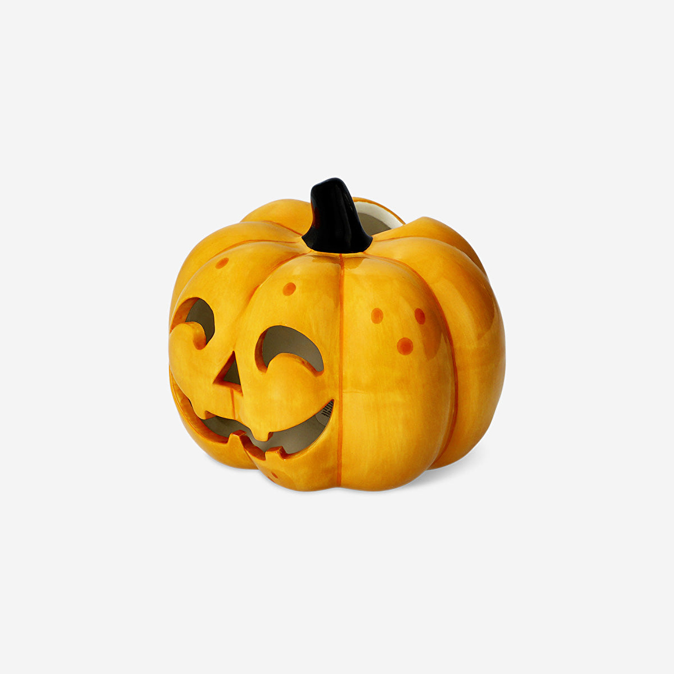 Balkabağı Şeklinde Seramik LED Fener, Halloween ve sonbahar dekorasyonlarınıza neşeli bir atmosfer katmak için özenle tasarlanmıştır. Klasik turuncu seramik gövdesi, parlak siyah sapı ve oyulmuş gülen yüz detayı ile öne çıkan bu fener, 13,5 x 11,3 x 12,3 cm ölçülerinde olup raf, pencere kenarı veya masa üzerinde sergilemek için ideal boyuttadır. Kesik detayları sayesinde ışığı hoş bir şekilde dışarı yansıtarak bulunduğu ortama sıcak ve davetkâr bir parıltı katar.