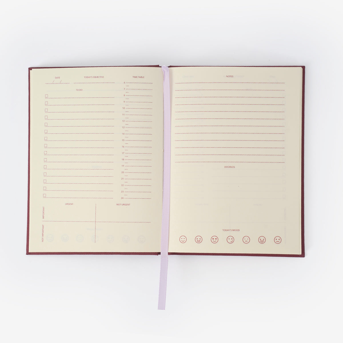 Bordo Tarihsiz Planlayıcı, her türlü planlama ihtiyacınızı karşılayacak şık ve fonksiyonel bir araçtır. Bu defterin tasarımında, esnek ve kişisel kullanım için tasarlanmış, tarihsiz format kullanılmıştır. Böylece, istediğiniz zaman başlamanıza olanak tanır ve gün, hafta ya da ay takibi yaparken esneklik sağlar. Bu planlayıcı, her an plan yapmanız gerektiğinde yanınızda taşıyabileceğiniz kadar kompakt olmasına rağmen, yeterli alan sunarak tüm hedeflerinizi yazılı hale getirmenize yardımcı olur.