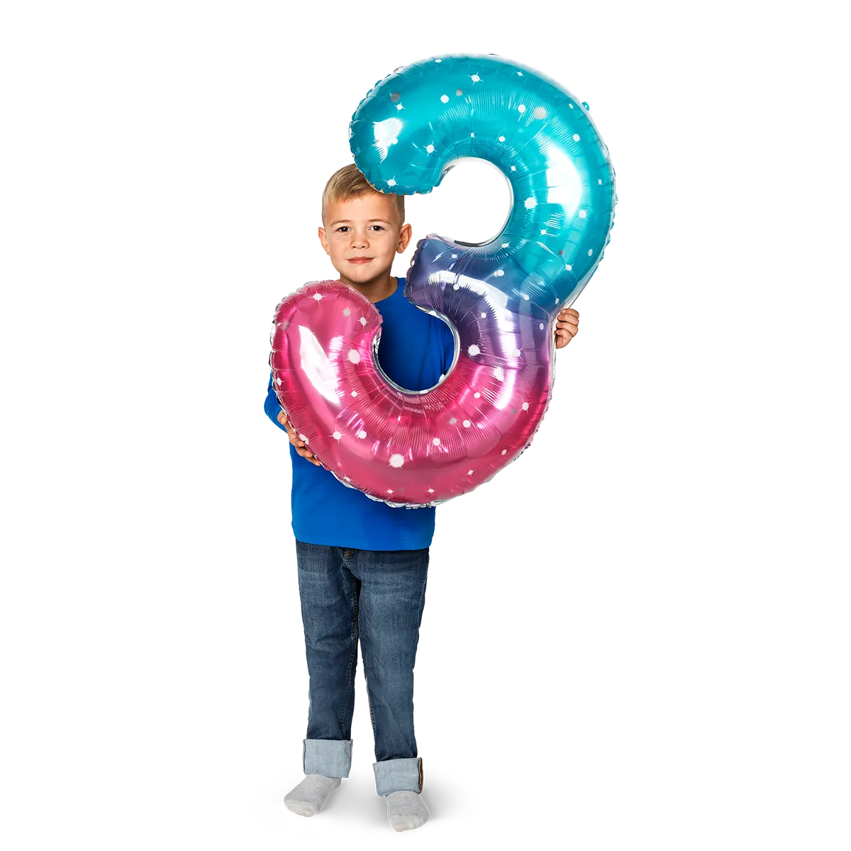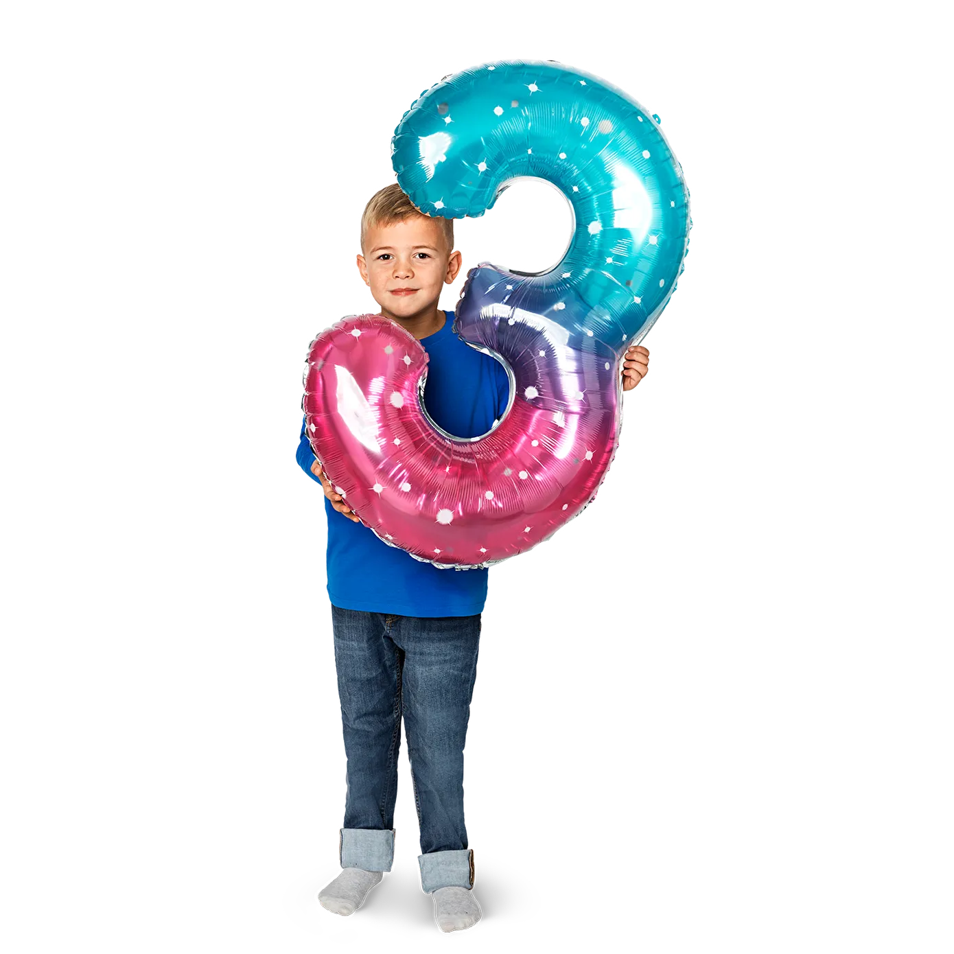 Pembe Mavi Parlak 3 Numaralı Folyo Balon, özel kutlamalarınızı daha da özel ve göz alıcı hale getirmek için mükemmel bir seçenektir. Parlak pembe ve mavi renkleriyle tasarlanmış bu büyük balon, 3 numaralı rakam şeklinde olup, doğum günleri, ilk yaş kutlamaları veya diğer özel etkinlikler için ideal bir dekoratif öğedir. Folyo malzemeden üretilmiş olması sayesinde dayanıklı ve uzun süre kullanılabilir.