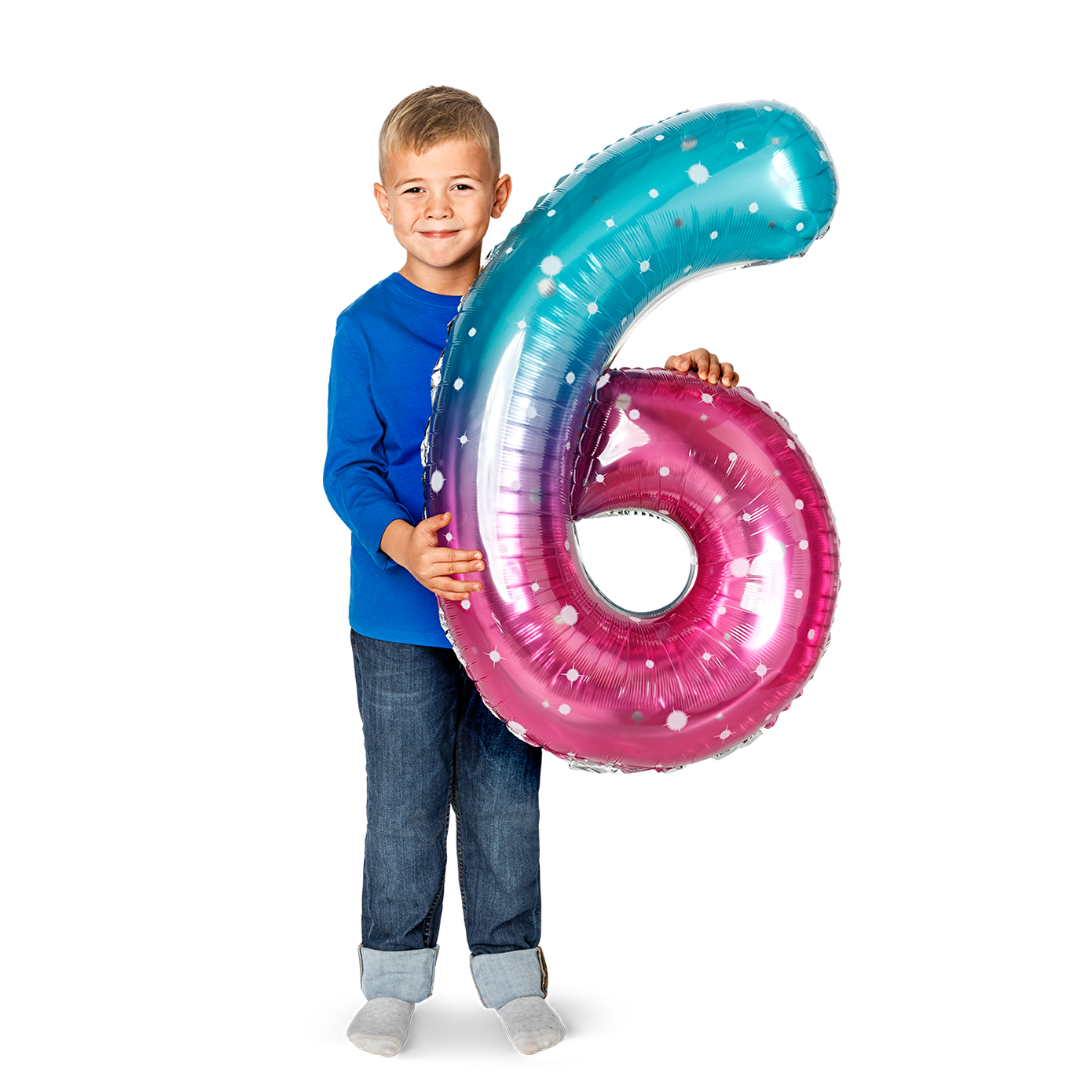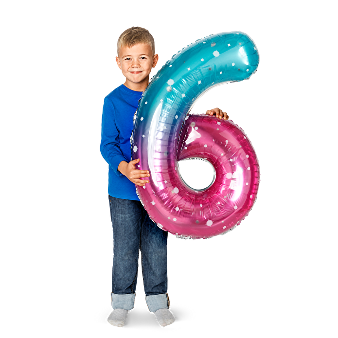Pembe Mavi Parlak 6 Numaralı Folyo Balon, özel kutlamalarınızı daha da özel ve göz alıcı hale getirmek için mükemmel bir seçenektir. Parlak pembe ve mavi renkleriyle tasarlanmış bu büyük balon, 6 numaralı rakam şeklinde olup, doğum günleri, ilk yaş kutlamaları veya diğer özel etkinlikler için ideal bir dekoratif öğedir. Folyo malzemeden üretilmiş olması sayesinde dayanıklı ve uzun süre kullanılabilir.