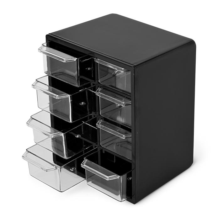 Çekmeceli Depolama Kutusu Siyah, 8 çekmeceli bir hobi malzemeleri düzenleme kutusudur. Şık ve pratik tasarımı sayesinde tüm depolama ihtiyaçlarınızı karşılayan bu kutu, her el işi tutkununun çalışma alanı için vazgeçilmez bir parçadır. 8 geniş çekmecesi sayesinde boncuklar, iplikler, araçlar ve diğer küçük eşyalarınızı düzenli bir şekilde saklar ve kolayca erişilebilir durumda tutar.