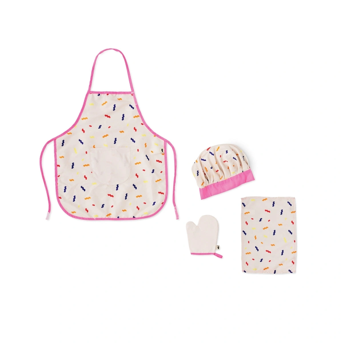 Minik şefler için tasarlanan bu çocuk kostüm seti, mutfakta eğlenceli oyunlar oynamayı seven çocuklara özel olarak hazırlanmıştır. Set; renkli desenli bir önlük, uyumlu bir şef şapkası ve küçük bir fırın eldiveninden oluşur. Yumuşak kumaşı sayesinde rahat bir kullanım sunar ve tüm çocuklara uygun tek bedendir.