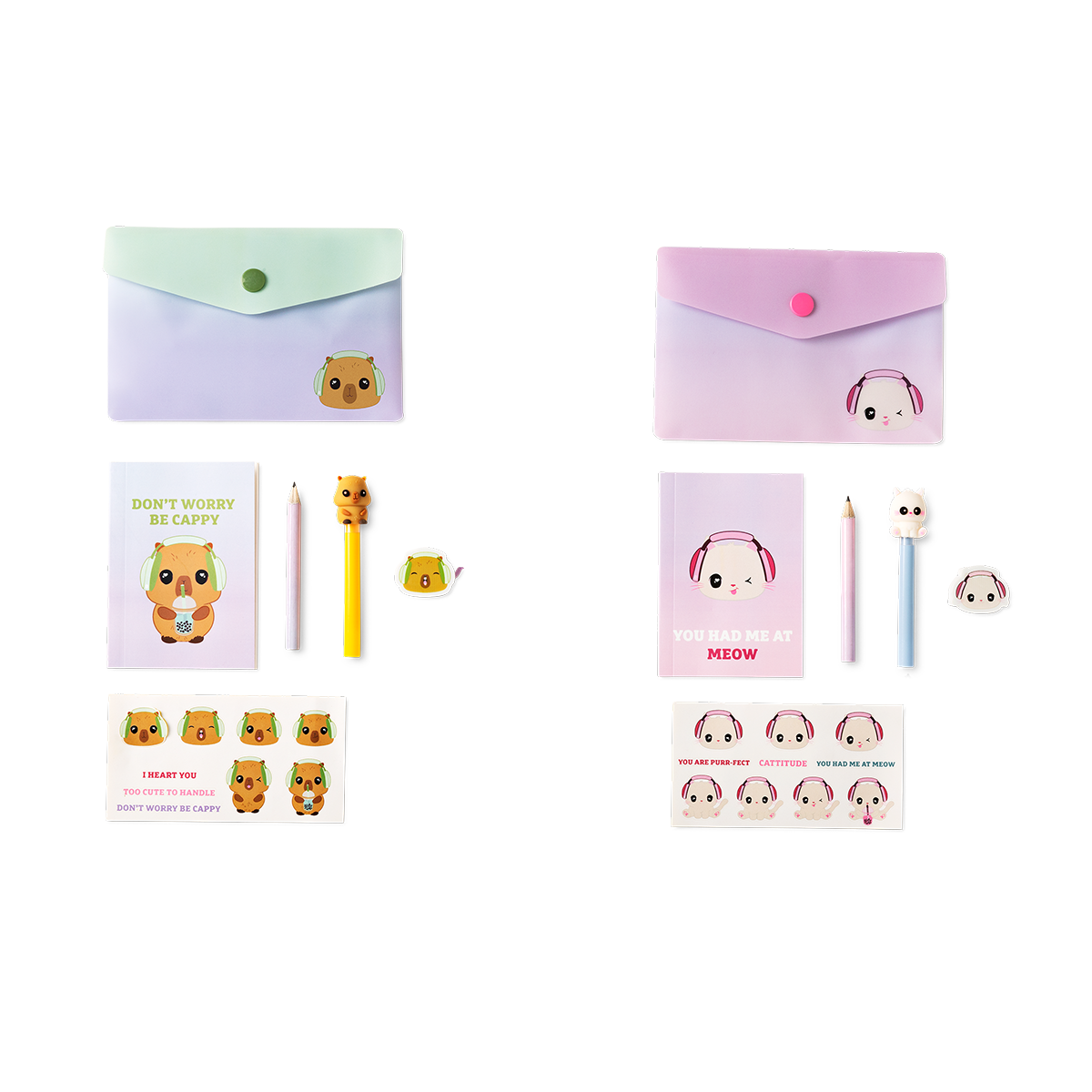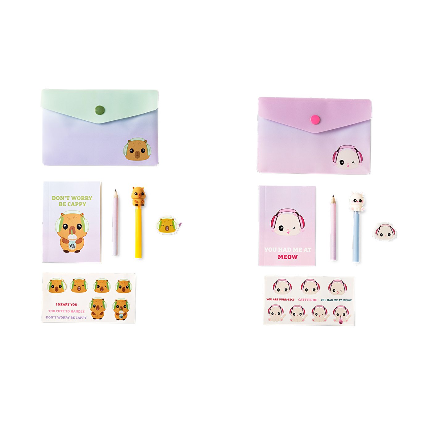 Hayvan Desenli Sürpriz Kırtasiye Kiti, sevimli hayvan figürleriyle süslenmiş bir dosyanın içinde, her biri sürpriz kırtasiye ürünleriyle dolu bu kit, masa başında yaratıcı bir deneyim yaşamanızı sağlar. İçerisinde kalemler, silgiler, not kağıtları ve daha birçok kırtasiye malzemesi bulunan bu kit, her yaş için mükemmel bir hediye veya kişisel kullanım için eğlenceli bir aksesuar sunar.