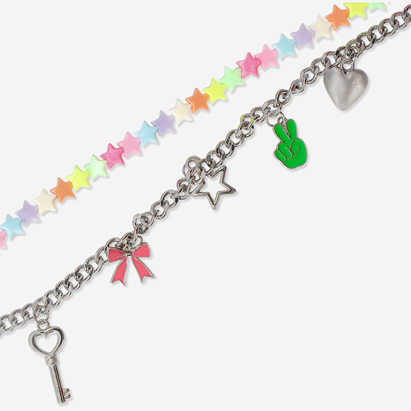 İncili Metal Çanta Zinciri, şıklık ve eğlenceyi bir araya getiren zarif bir aksesuardır. Canlı renkli inciler, yıldız boncuklar ve kalp, fiyonk, yıldız ile anahtar gibi sallanan charm’lar sayesinde çantanıza hareketli ve kişisel bir hava katar. Kalp şeklindeki sağlam klipsleri, zinciri çanta sapına, sırt çantasına ya da kemer köprülerine kolayca takmanıza olanak tanır.