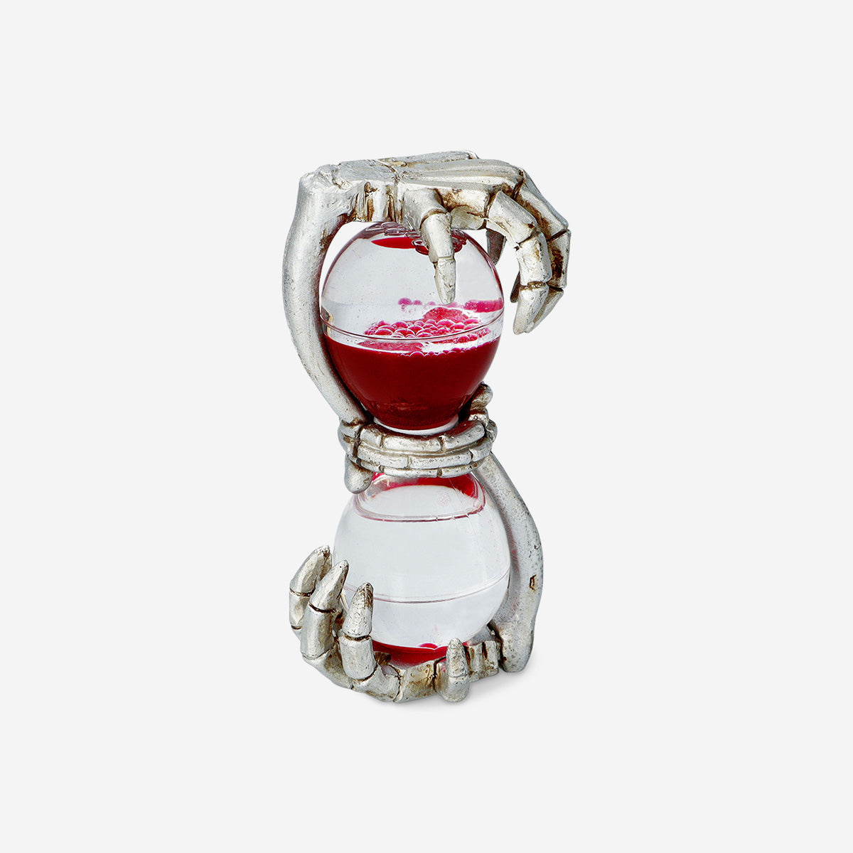 İskelet Detaylı Gotik Kum Saati, Halloween dekorasyonlarınıza zamansız ve ürkütücü bir zarafet katan dikkat çekici bir parçadır. 8,2 x 15,7 x 5,66 cm boyutlarındaki bu dekoratif aksesuar, karmaşık detaylarla oyulmuş iskelet elleri tarafından tutuluyormuş gibi görünen iki cam hazneye sahiptir. Eller, sanki zamanı yakalamış gibi dramatik bir pozda tasarlanmış olup, beyaz kumun hazneler arasında ağır ağır akışıyla büyüleyici bir görsel atmosfer yaratır.