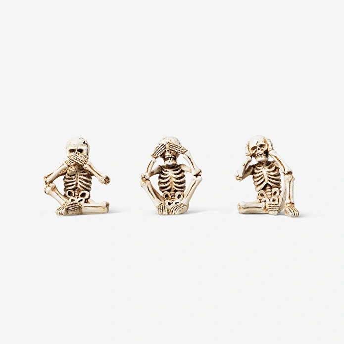 İskelet Maymun Seti, Halloween dekorasyonunuza hem mizahi hem de ürkütücü bir dokunuş eklemek için tasarlanmıştır. Üçlü set, klasik “kötülüğü görme, kötülüğü duymama, kötülüğü söylememe” pozlarını canlandıran figürlerden oluşur ve bu ikonik jestlere kemiksi bir yorum getirir. Plastikten üretilmiş, bej tonlarda kemik efektli yüzeyiyle gerçekçi bir görünüm sunarken kompakt boyutu sayesinde masalara, raflara veya parti düzenlemelerine kolayca eklenebilir.