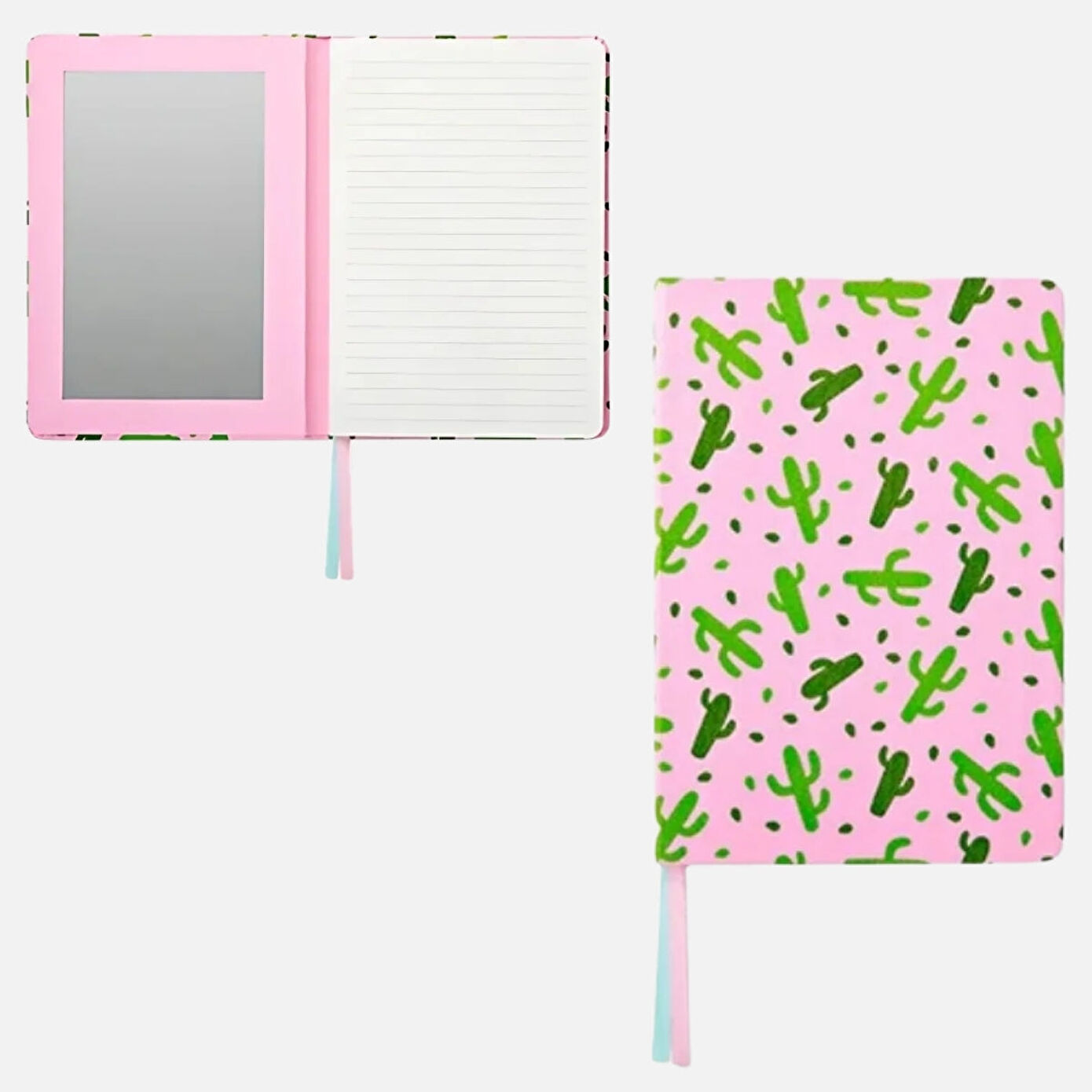 Kaktüs Desenli Ayna Detaylı A5 Defter, notlarınızı ve fikirlerinizi kaydederken şıklığı ve eğlenceyi bir araya getiriyor. 21 x 14,8 cm boyutlarındaki bu A5 boyutlu defter, kağıttan üretilmiştir ve pürüzsüz bir yazma yüzeyi sunar. Dış kapağında renkli ve eğlenceli kaktüs desenleri bulunur, aynı zamanda şık bir ayna detayına sahip olması, deftere benzersiz bir görsel çekicilik katmaktadır.