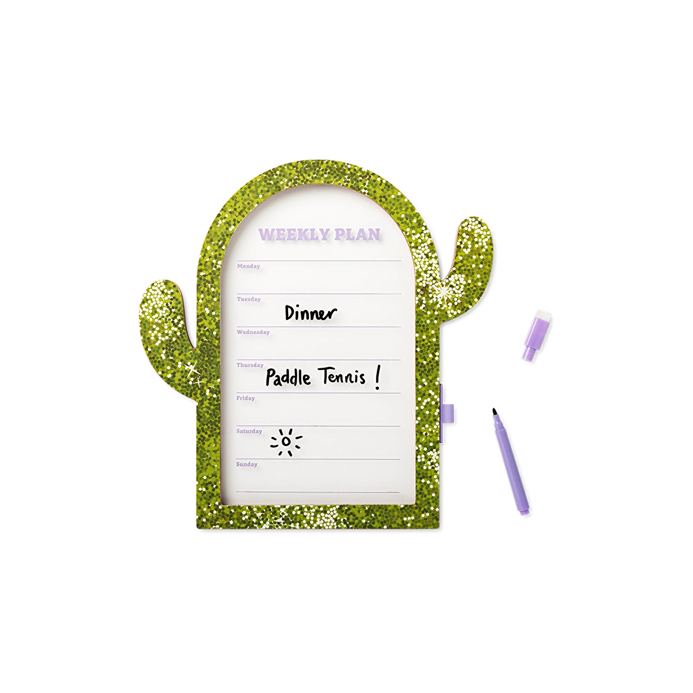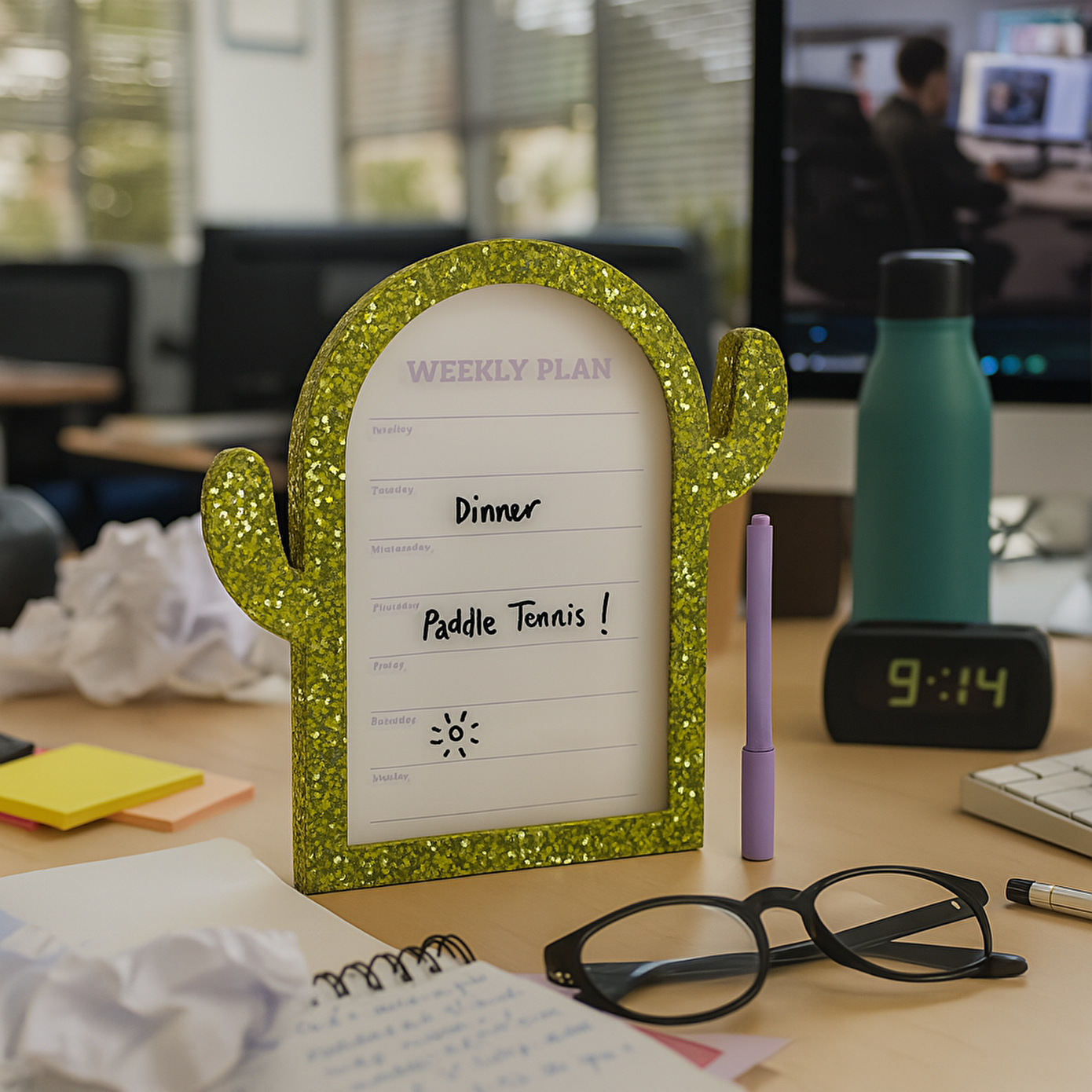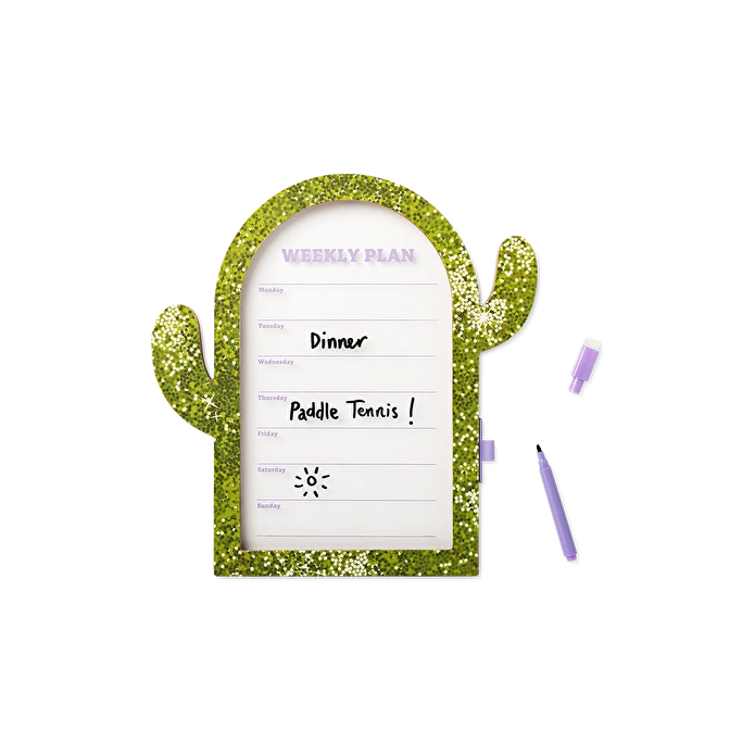 Kaktüs Şeklinde Çerçeveli Haftalık Planlayıcı, çalışma alanınıza hem stil hem de işlevsellik katmak için mükemmel bir araçtır. Yeşil kaktüs şeklindeki çerçevesi, programınızı takip ederken eğlenceli bir dokunuş ekler. Plastik ve camdan üretilen bu planlayıcı tahtası, yazma ve silme kolaylığı sağlayan pürüzsüz yüzeyi ile randevuları, hatırlatıcıları veya yapılacaklar listesini organize etmek için idealdir. 30 x 29 x 1,2 cm boyutlarında olup, fazla yer kaplamadan haftalık notlarınızı yazabileceğiniz geniş bir alan sunar.