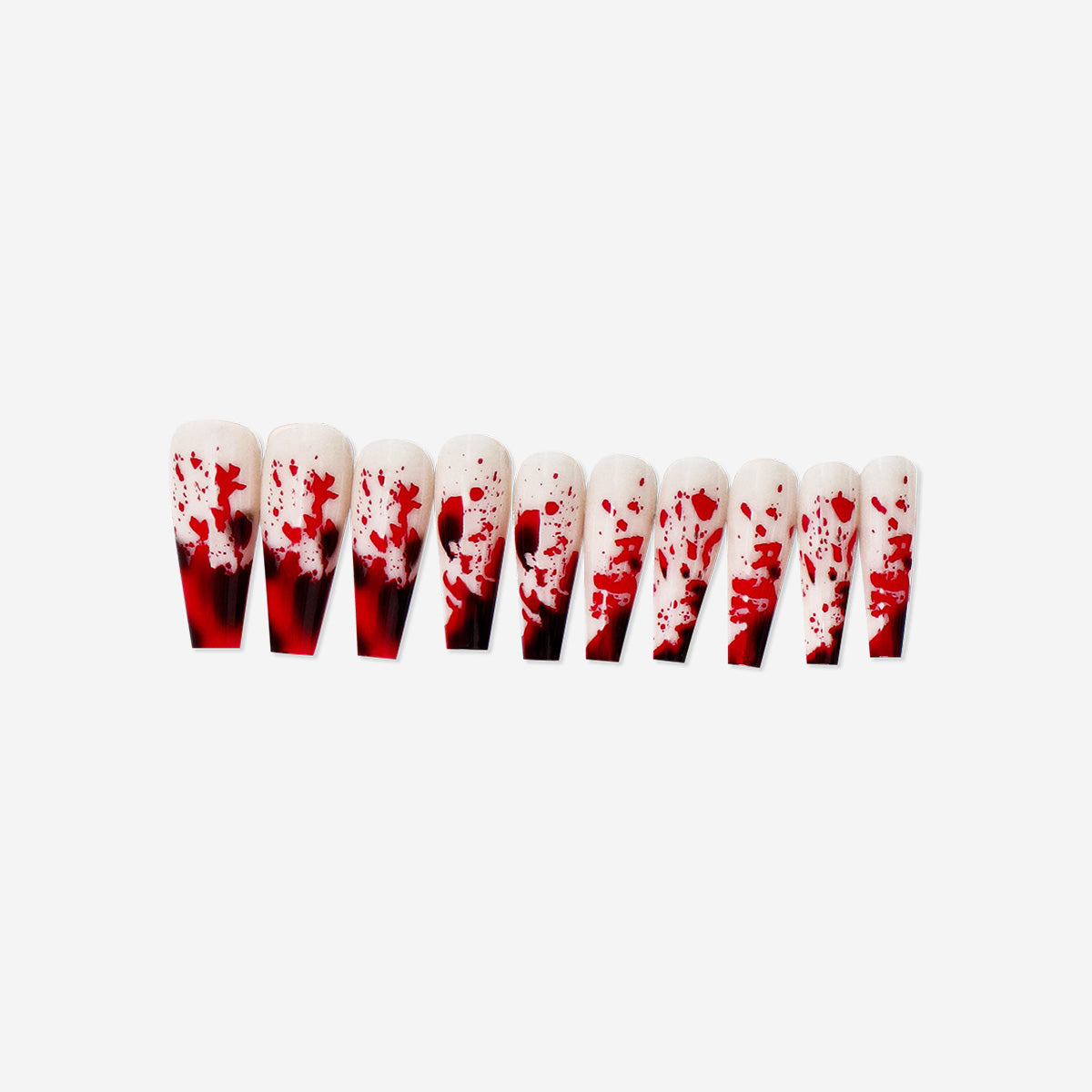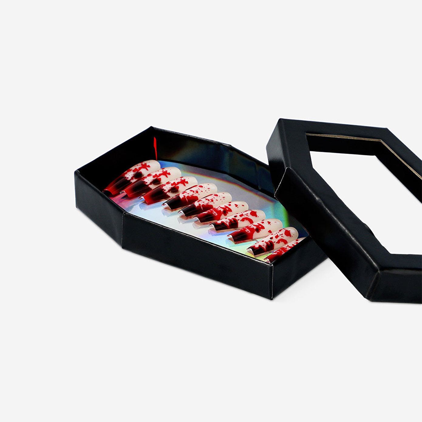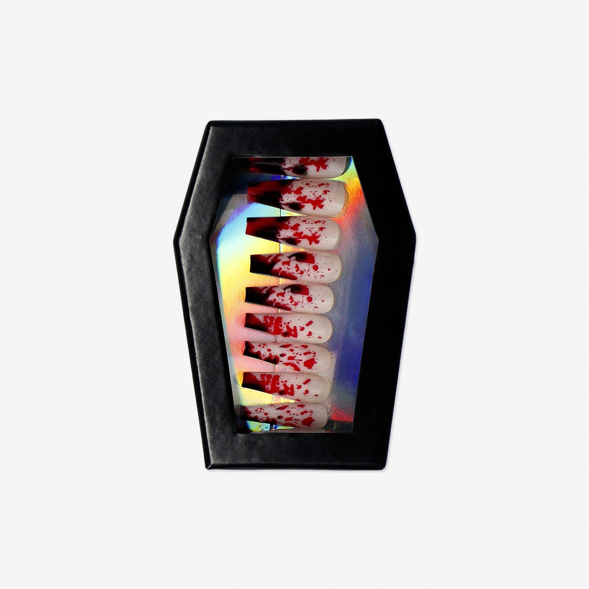Kan Detaylı 24'lü Takma Tırnak Seti, Halloween stilinize korkutucu ama şık bir vurgu katmak için tasarlanmış göz alıcı bir aksesuardır. Üzerindeki kan sıçraması deseniyle ürkütücü bir atmosfer yaratan bu set, farklı boyutlarda 24 adet kırmızı yapay tırnaktan oluşur. Tabut şeklindeki özgün kutusu sadece saklama kolaylığı değil, aynı zamanda mevsim ruhunu yansıtan şık bir sunum da sağlar.
