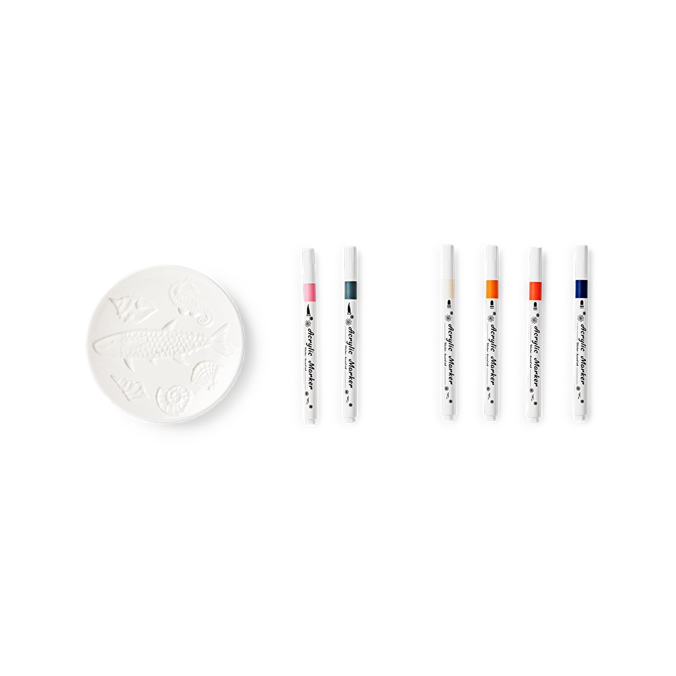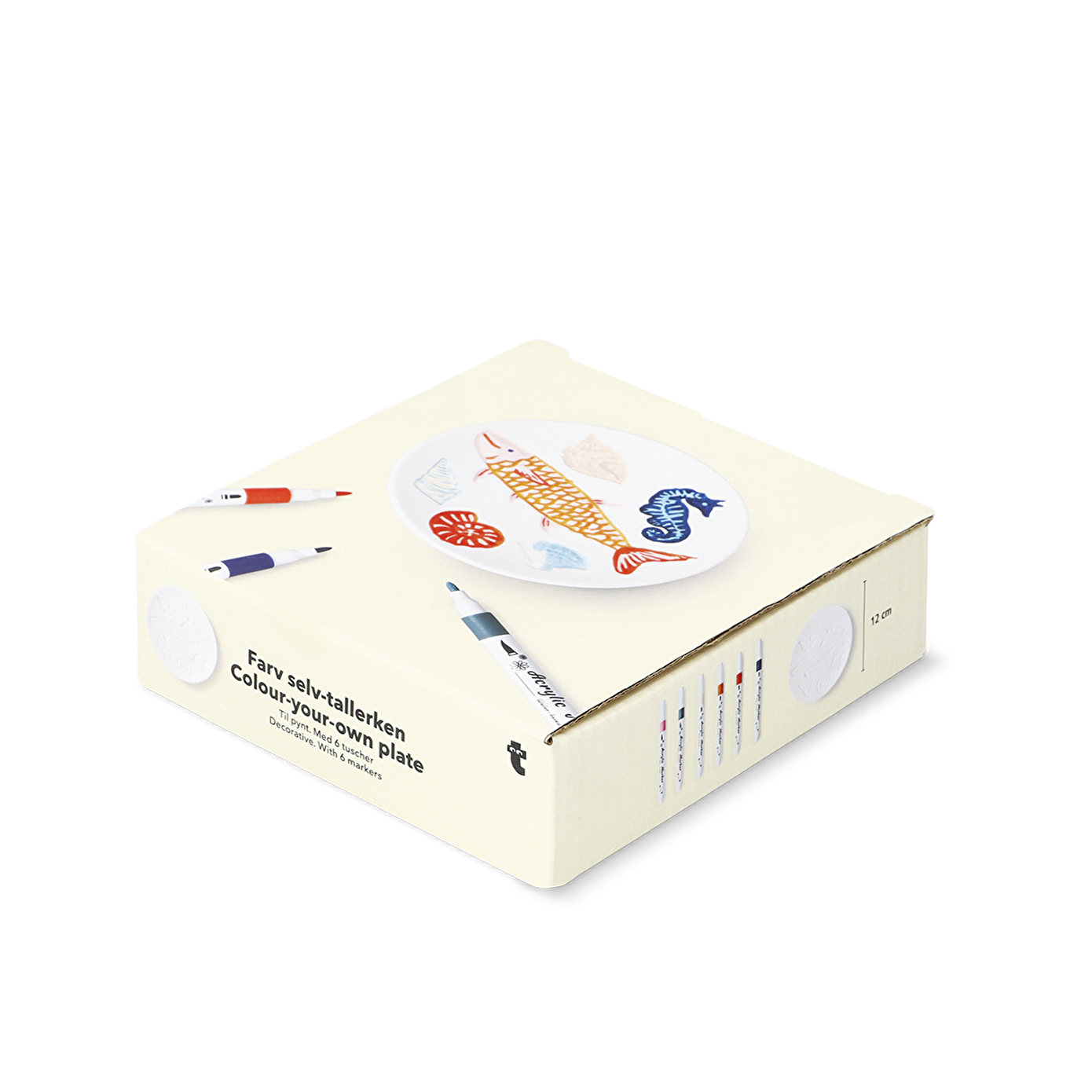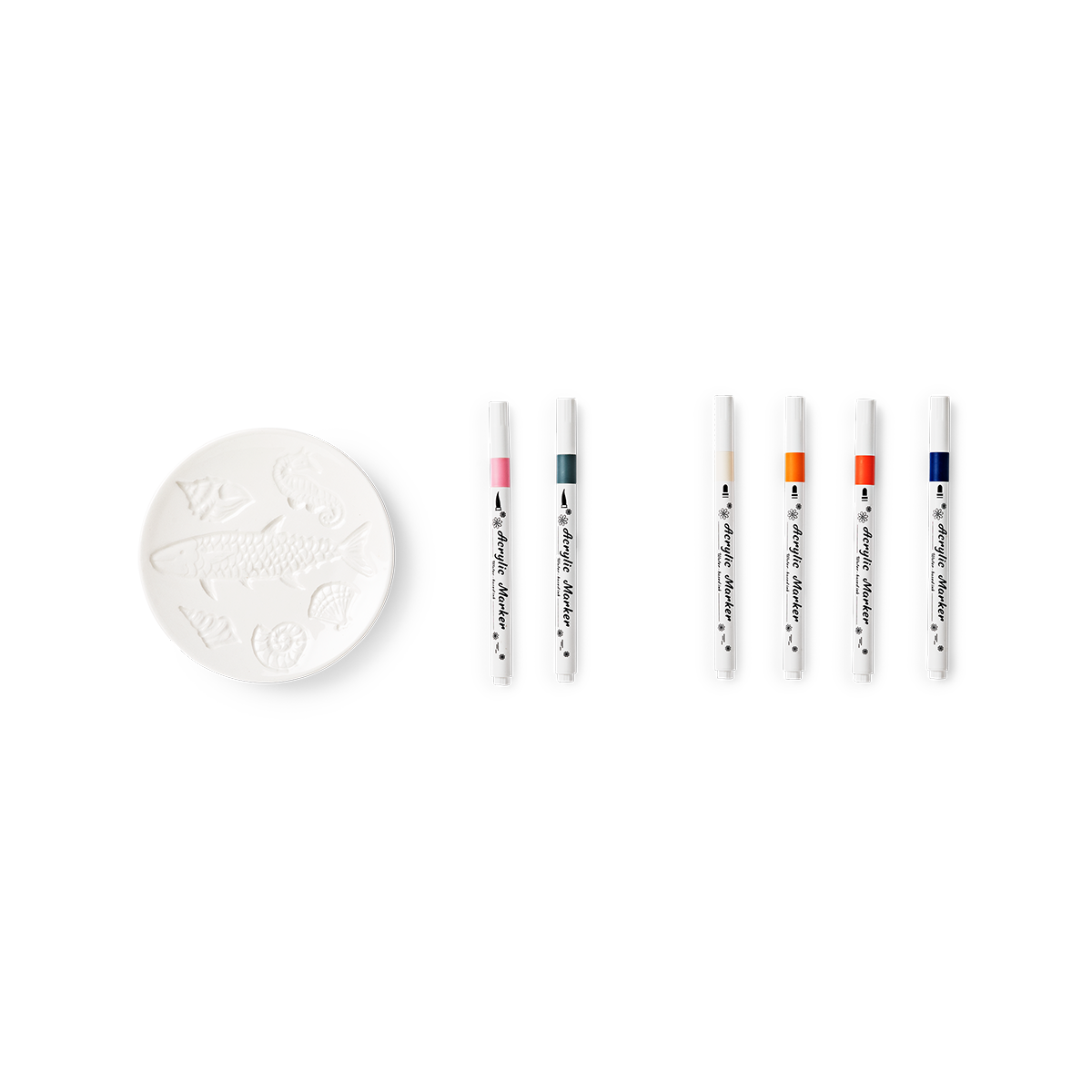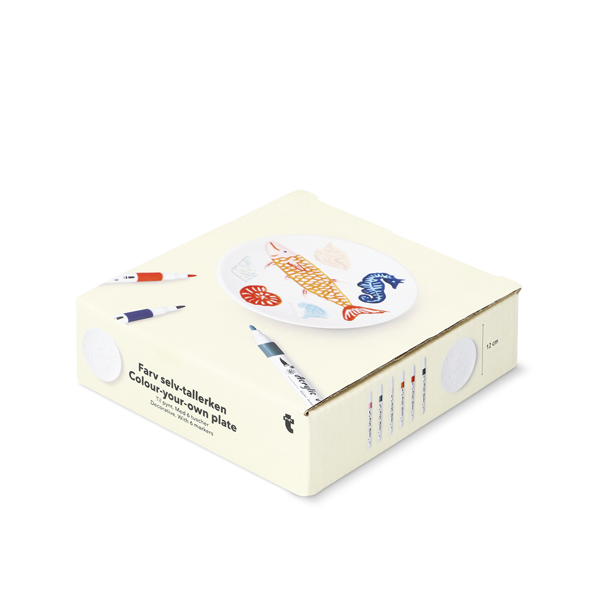Kendin Yap Seramik Tabak Boyama Seti ile yaratıcı yeteneklerinizi ortaya çıkarın. Bu eğlenceli ve kolay boyama seti, 12 x 2 cm boyutlarındaki seramik tabağınızla başlıyor. Üzerinde okyanustan ilham alarak işlenmiş balıklar, deniz kabukları ve bir denizatı gibi zarif kabartmalı tasarımlar bulunuyor, böylece kendinizi yaratıcı bir dünyaya adım atmış gibi hissedeceksiniz. Set, beş adet hava ile kuruyan keçeli kalemle birlikte gelir, böylece tablalarınızı dilediğiniz gibi renklendirebilir ve tasarımınızı kişiselleştirebilirsiniz.