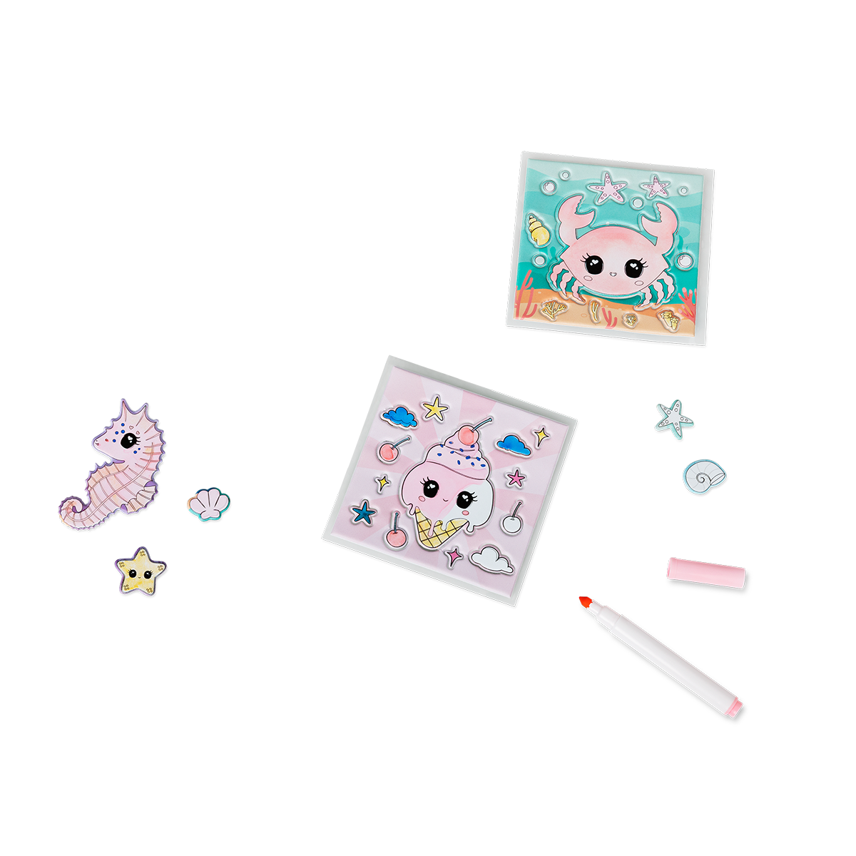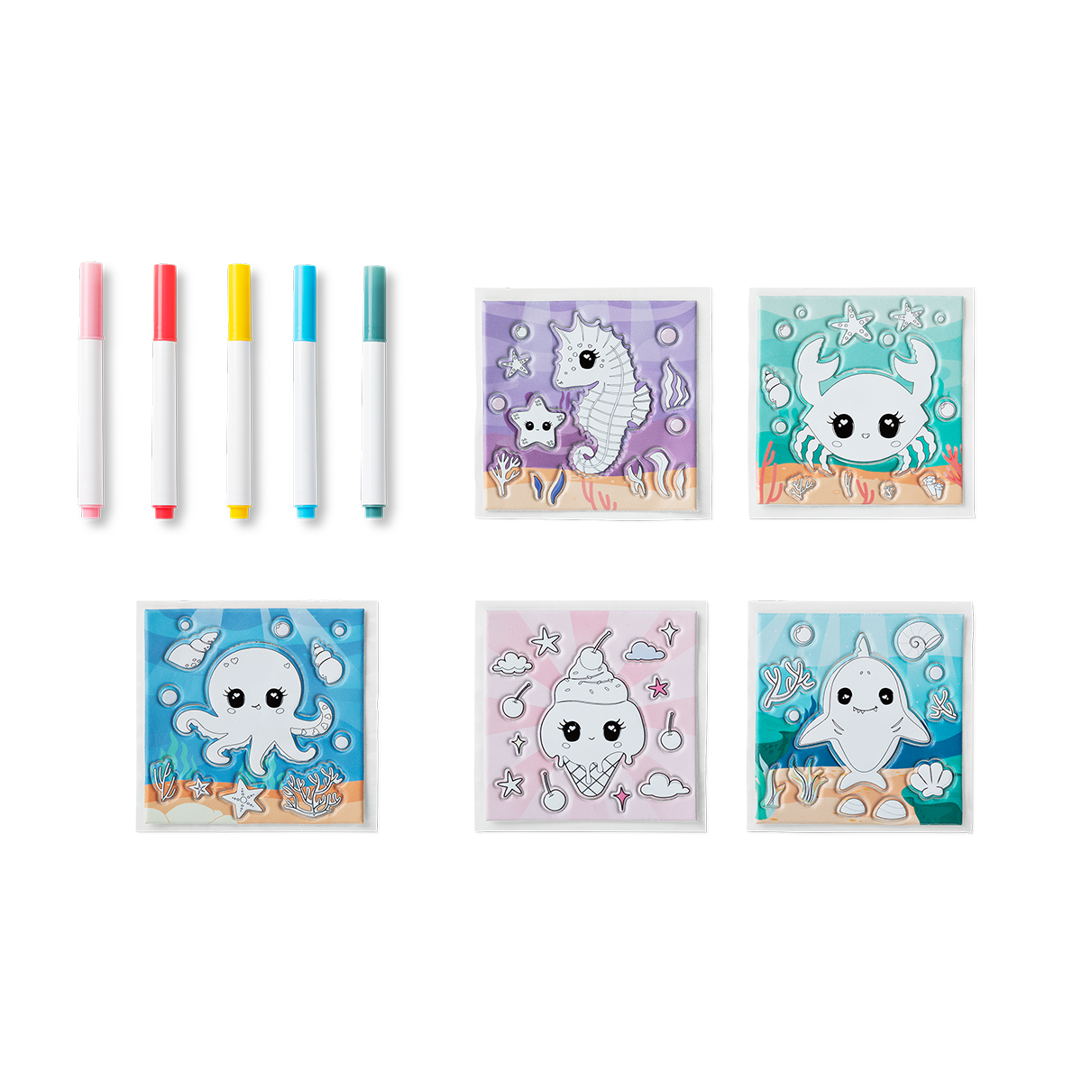 Kendin Yap Sticker Boyama Seti ile yaratıcılığınızı ortaya çıkarın. 8,8 x 8,8 cm boyutlarında olan bu set, beş sevimli çıkartma kağıdından oluşur ve her biri farklı, eğlenceli tasarımlara sahiptir. Setin içinde yer alan beş canlı renkli marker kalem, çıkartmalarınızı istediğiniz gibi boyamanızı sağlar ve projelerinize kişisel bir dokunuş katmanıza olanak verir. Çıkartmalar, plastikten üretilmiş olup, boyama ve süsleme için son derece kolaydır.