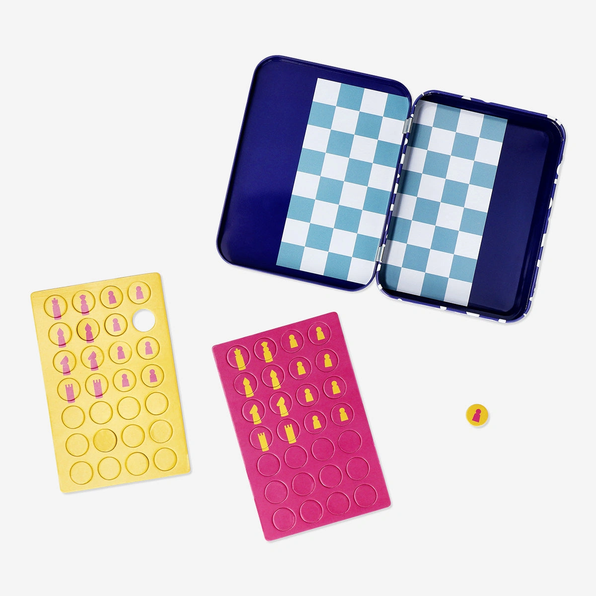 Metal Kutuda Mini Satranç Seti, hem satranç hem de dama oyunlarını bir araya getiren kompakt ve taşınabilir bir strateji oyunudur. 17 x 13 x 1,8 cm boyutlarındaki bu set, teneke kutuda düzenli bir şekilde saklanır ve seyahat, piknik veya evdeki sakin anlar için mükemmeldir. Manyetik tahta, hareket halindeyken bile stabiliteyi sağlar ve renkli oyun parçaları kolayca tutulabilir ve saklanabilir, böylece oyun deneyiminiz sorunsuz olur.