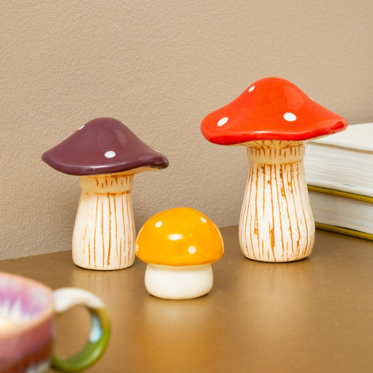 Neşeli çok renkli tonlarıyla Mini Seramik Sarı Mantar Biblo, tek başına minimal bir şıklık sunabileceği gibi farklı boyutlardaki seramik objelerle bir araya getirildiğinde daha da etkileyici bir bütünlük oluşturur. Özellikle peri bahçesi temalı düzenlemeler veya mevsimsel dekorasyonlarda hoş bir tamamlayıcı parça olarak öne çıkar. Küçük olmasına rağmen bulunduğu ortama doğallık, yumuşaklık ve eğlenceli bir hava katan bu mini mantar biblo, dekoratif koleksiyonlarınıza sevimli bir katkı sağlar.